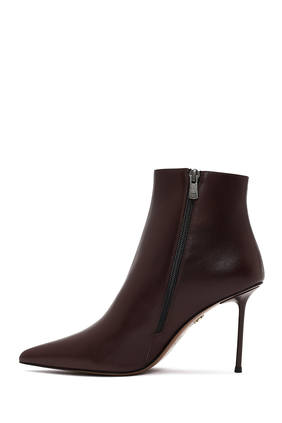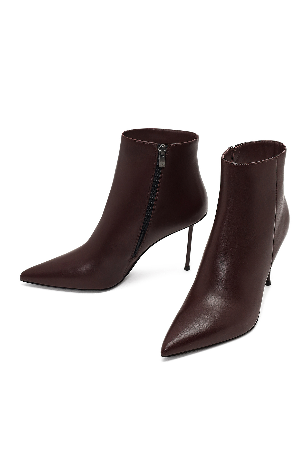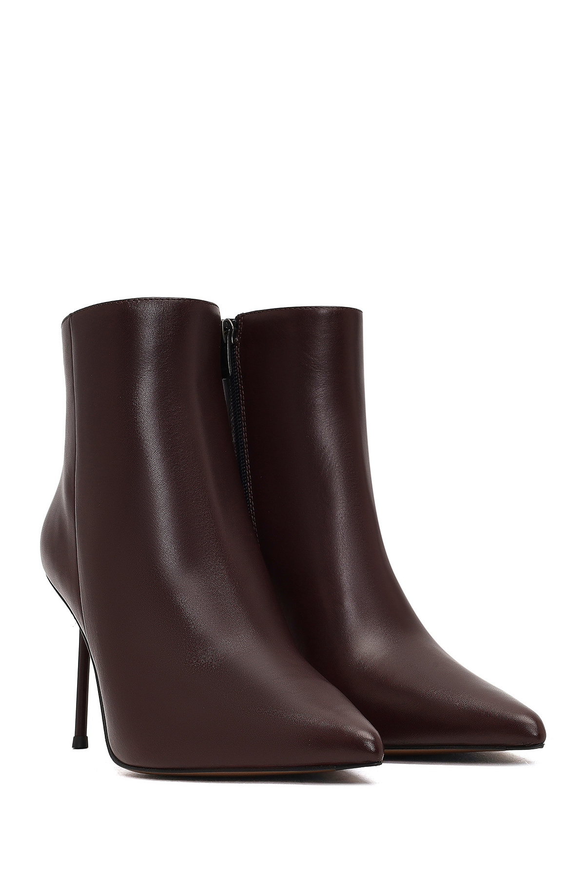 چکمه چرمی زنانه پاشنه باریک زرشکی زیپدار. ساخته شده از چرم گاو.