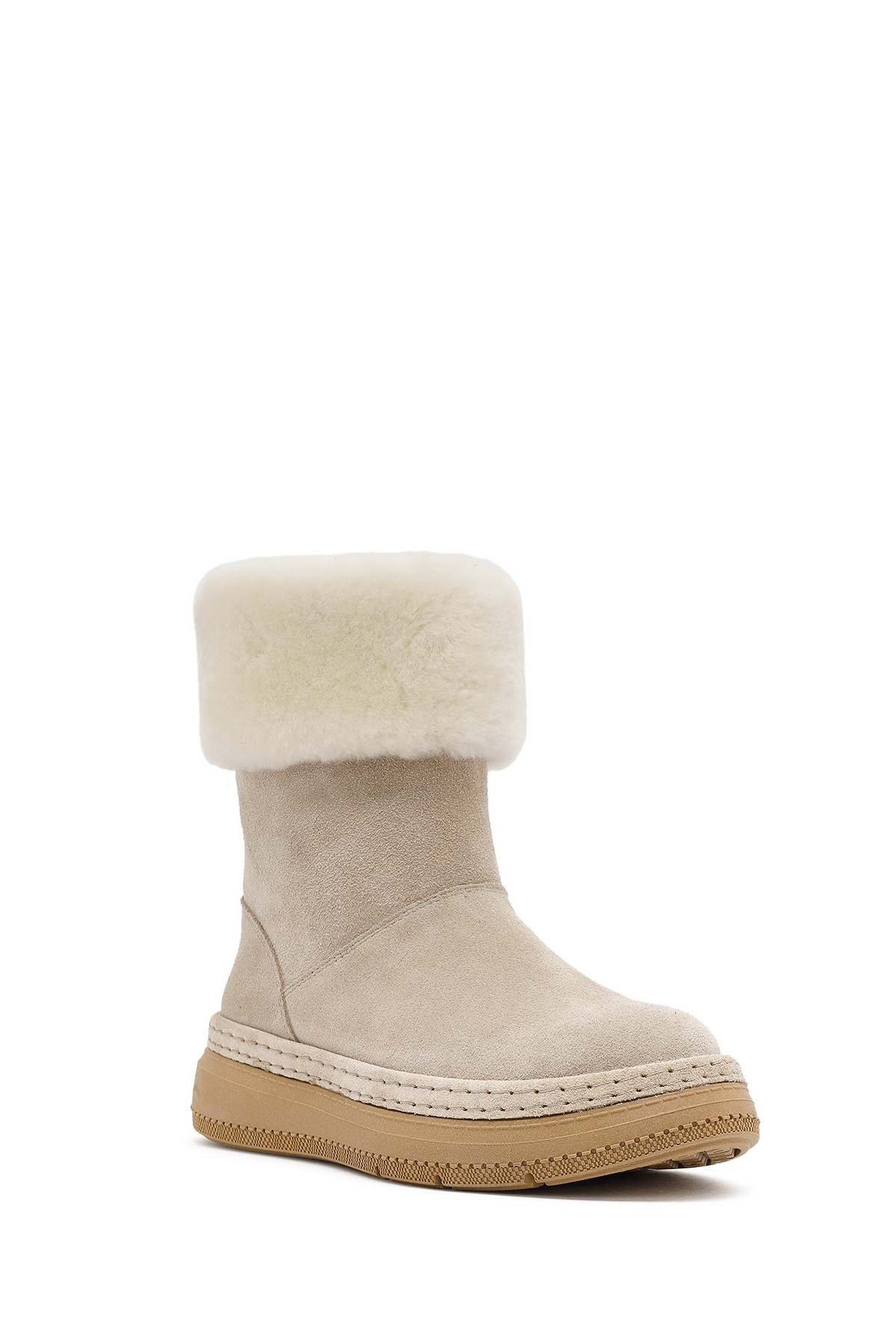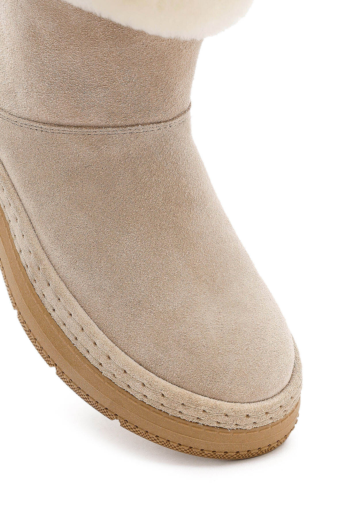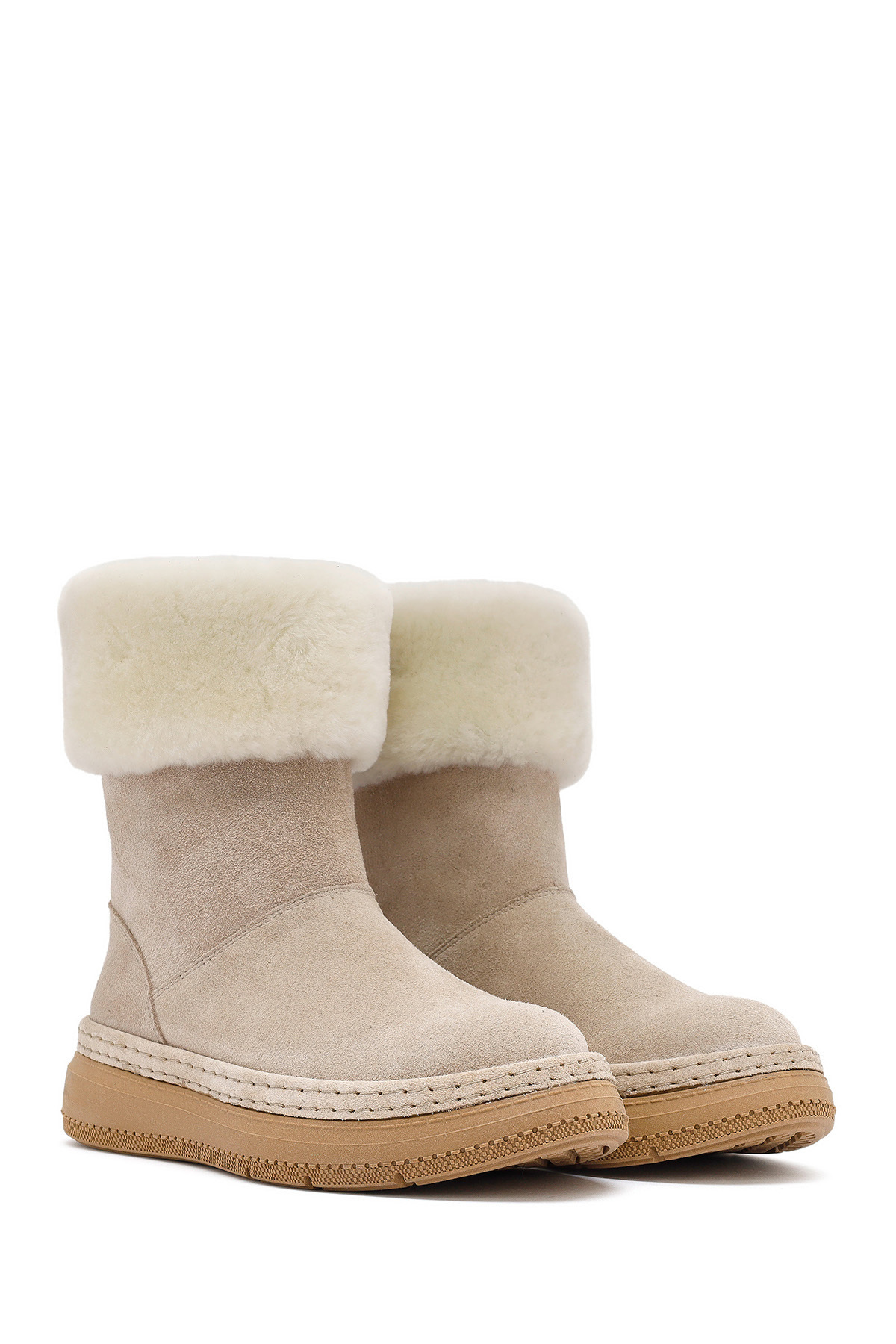 چکمه زنانه چرم جیر ضخیم بژ با جزئیات خزدار 25WFD133410