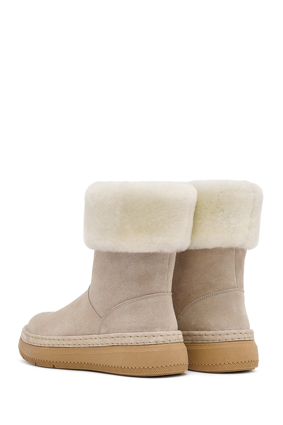چکمههای زنانه جیر با کفی ضخیم به رنگ بژ و جزئیات خزدار، حاوی چرم گاو هستند.