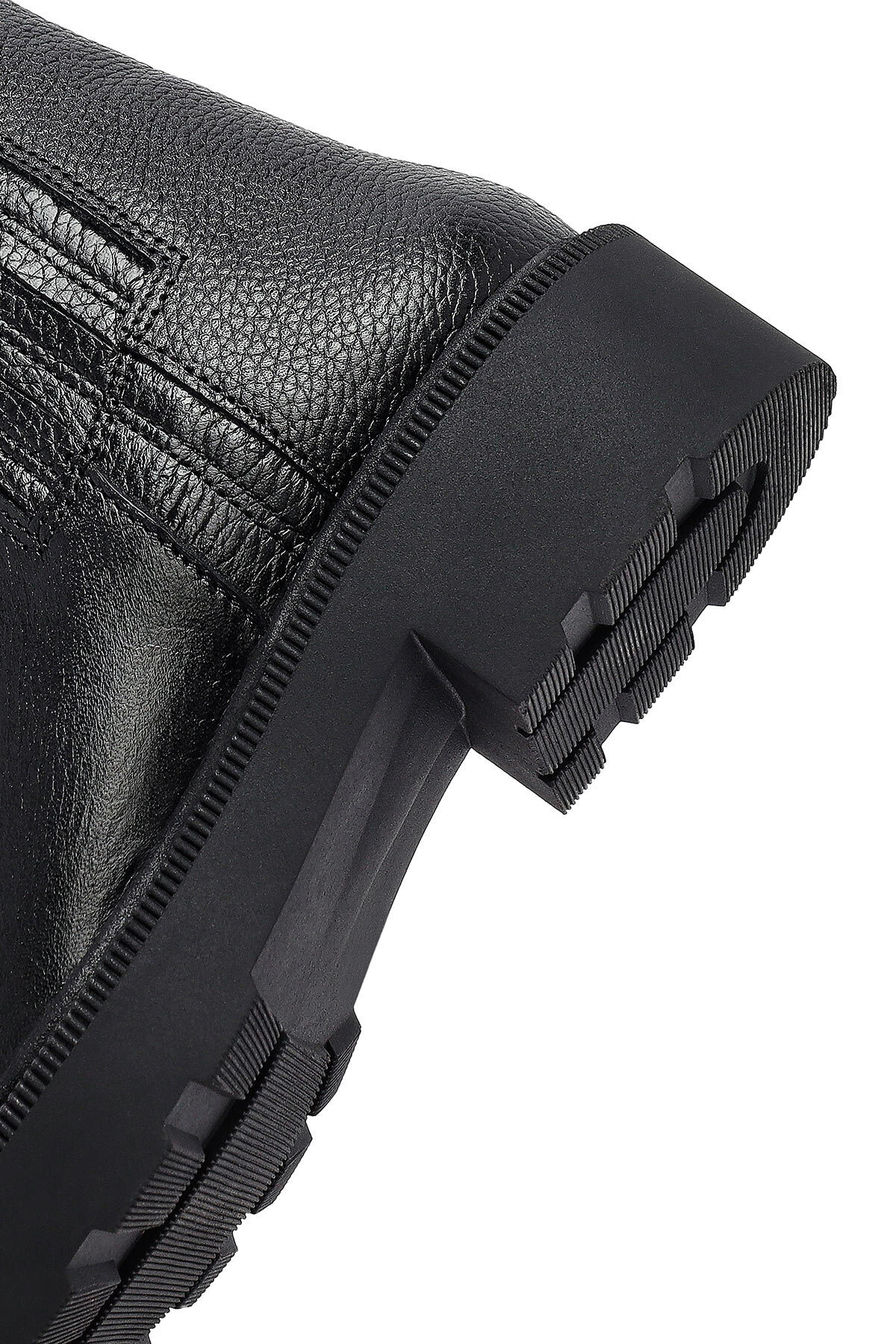 چکمههای چرمی زنانه مشکی زیپدار با کفی ضخیم، دارای چرم گاوی هستند.