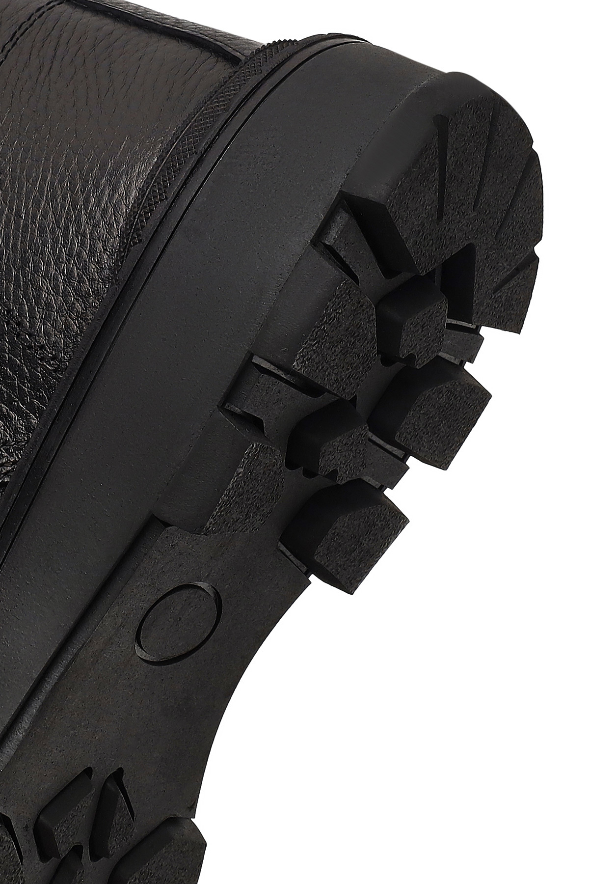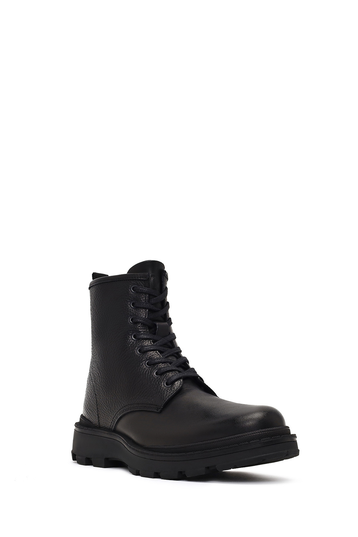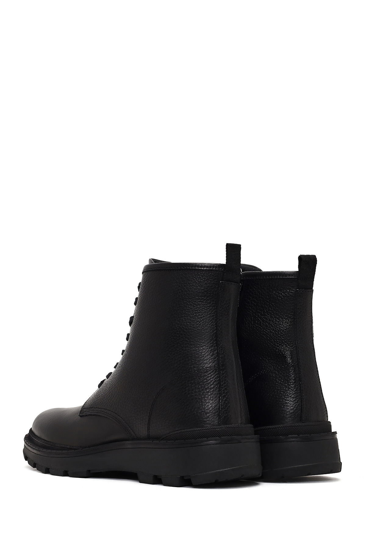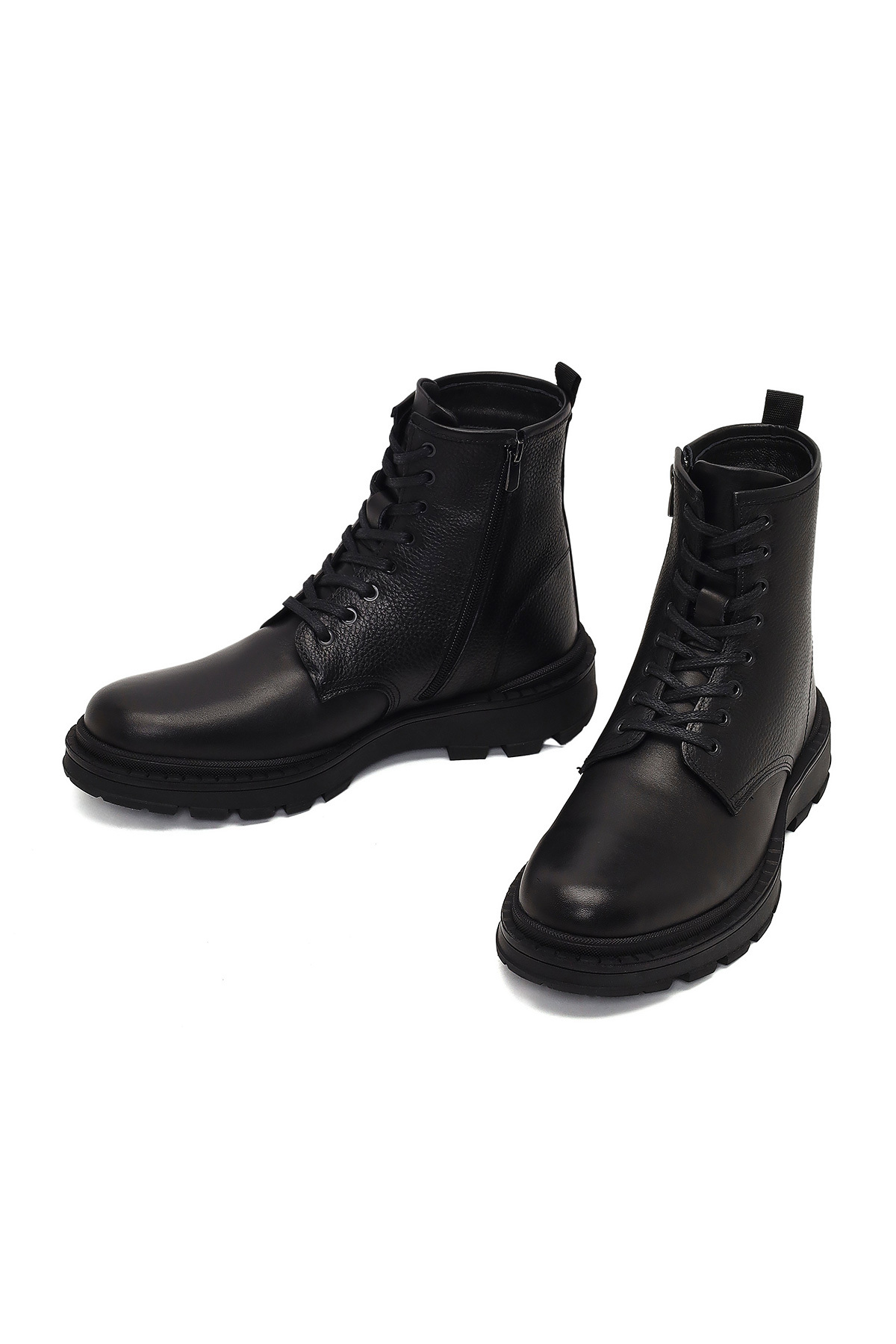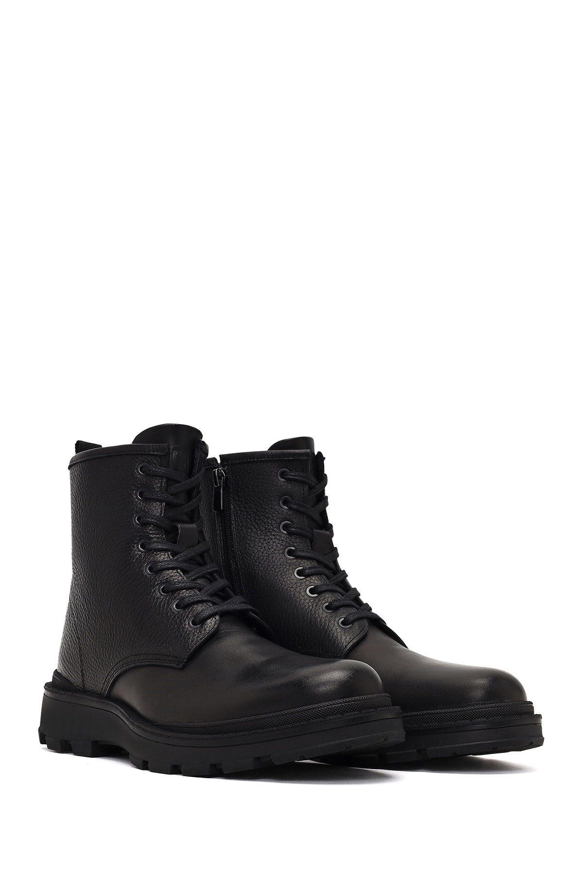 چکمههای چرمی مردانه مشکی بنددار زیپدار، دارای چرم گاوی هستند.