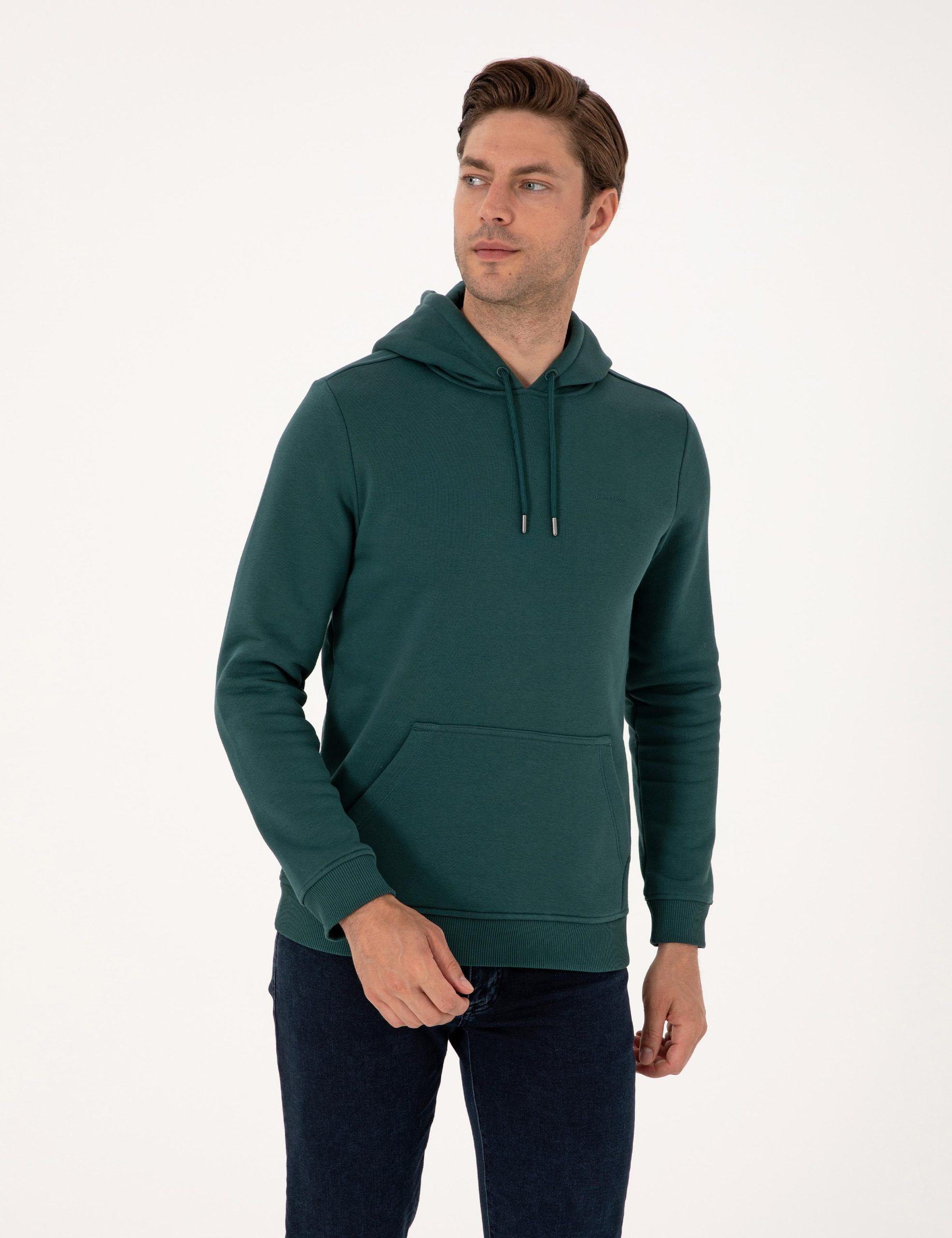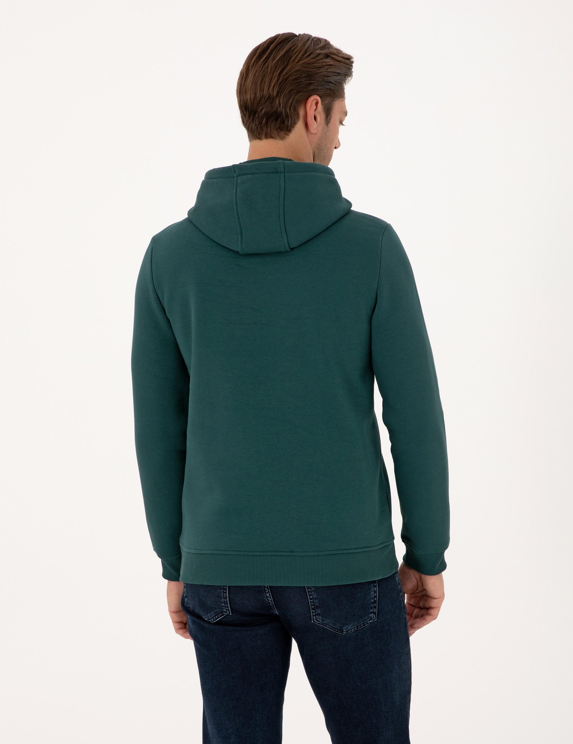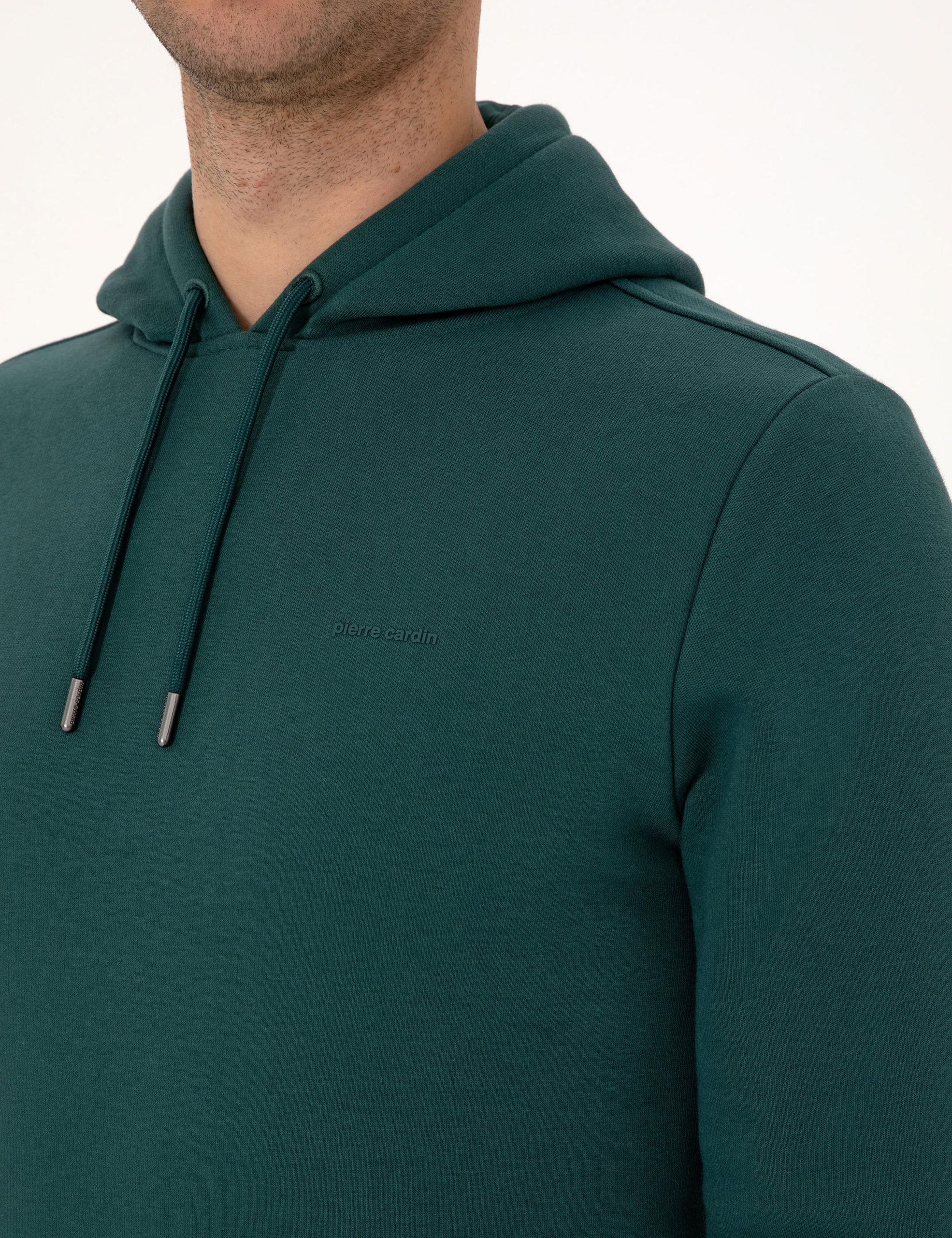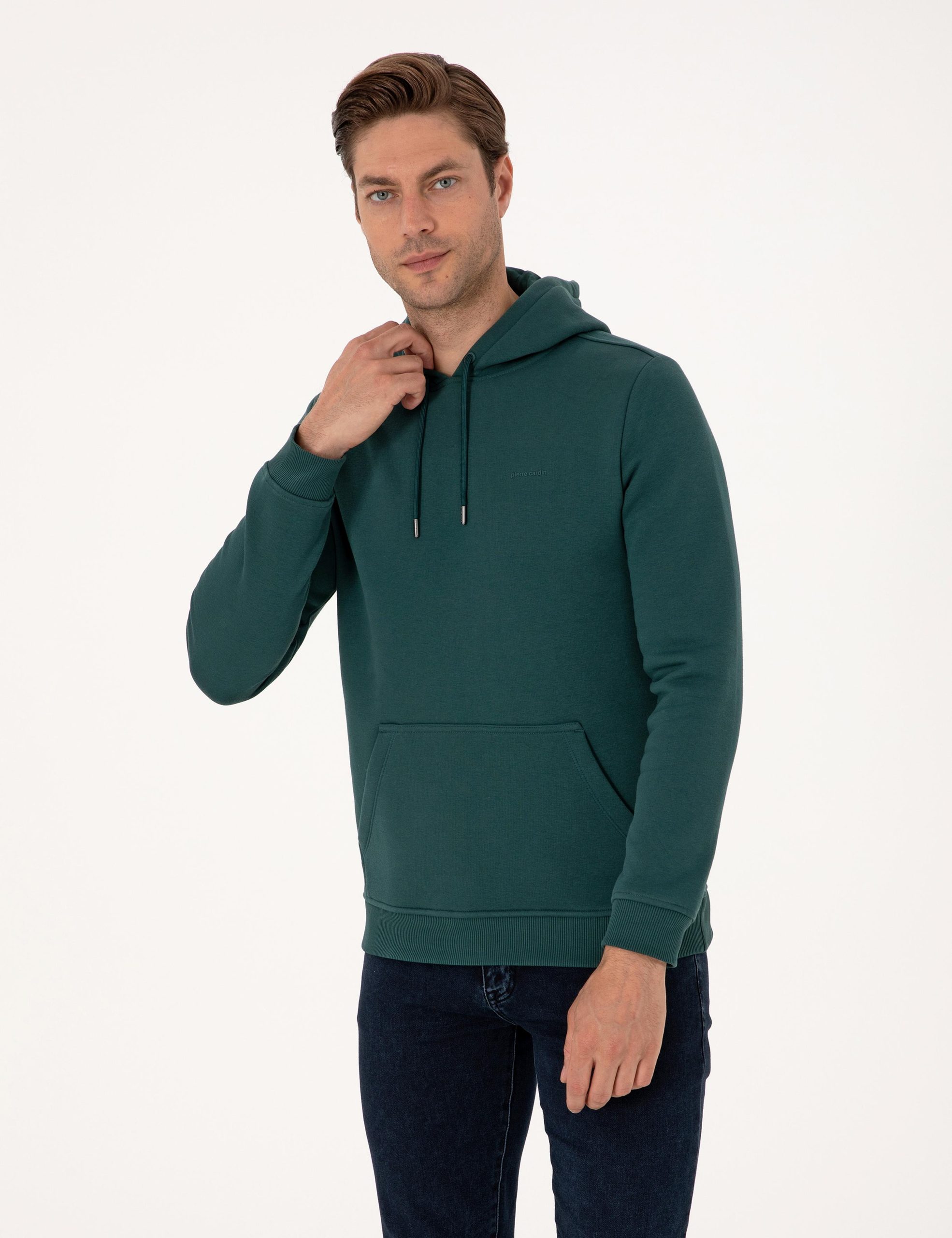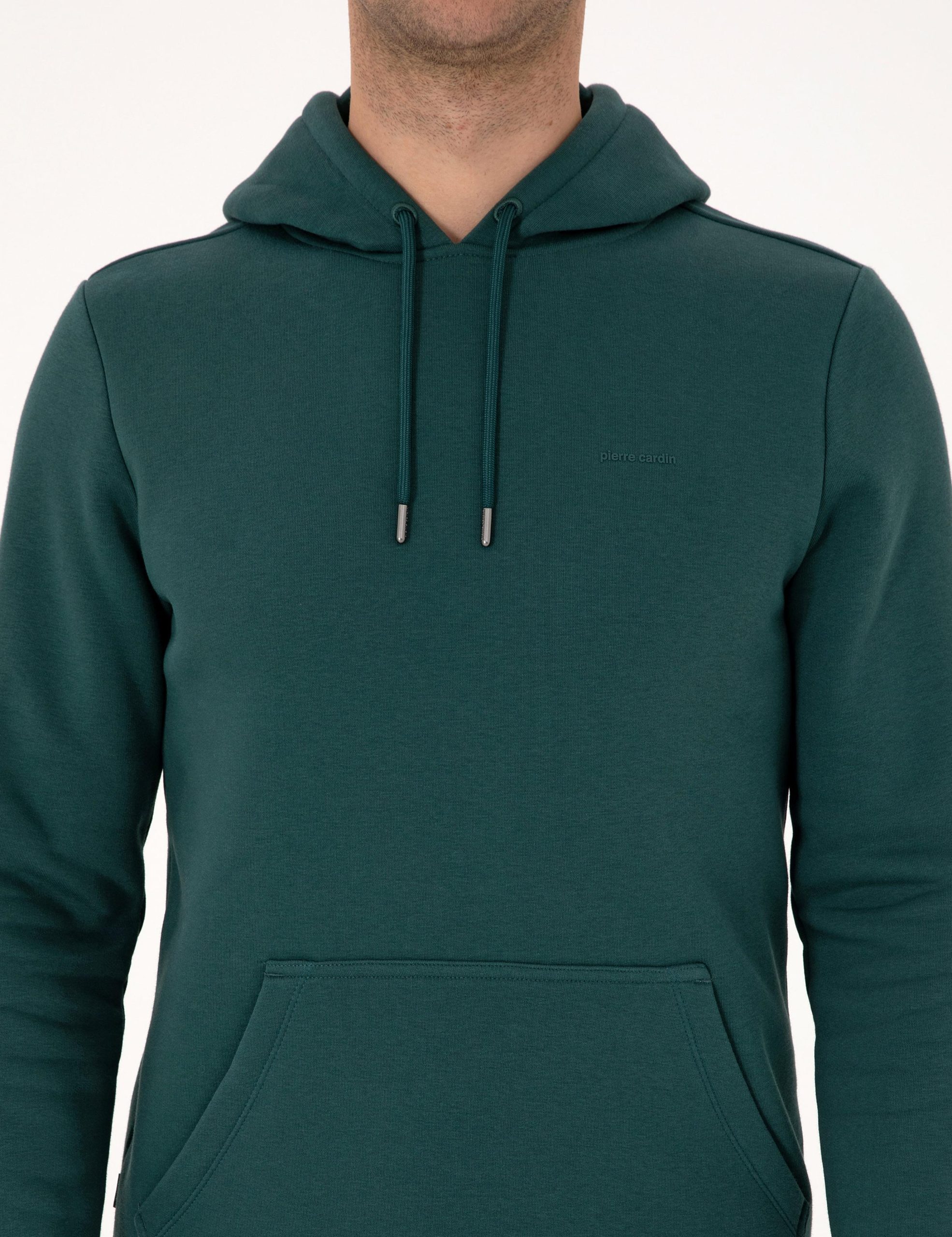 سویشرت زمرودی دو نخ رگولار فیت با پولار داخلی هودی ساده پیر کاردین