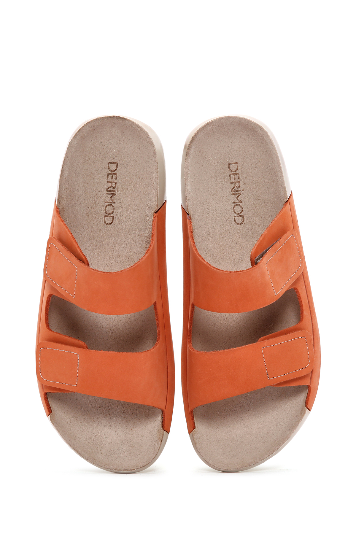 دمپایی راحتی زنانه چرم نبوک دو بند نارنجی حاوی چرم گاوی است.