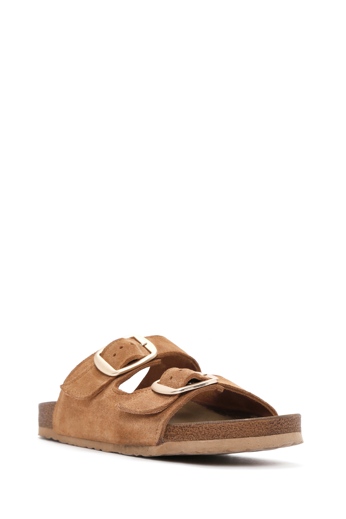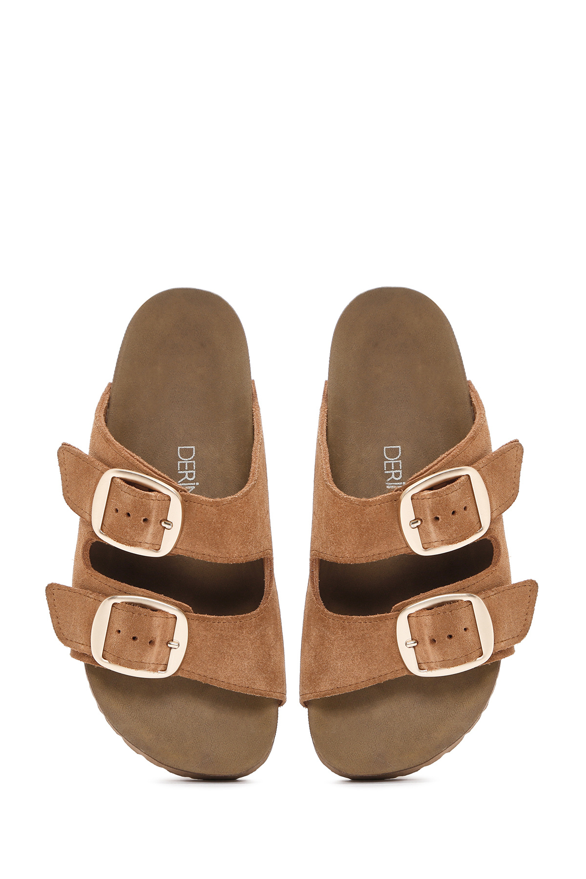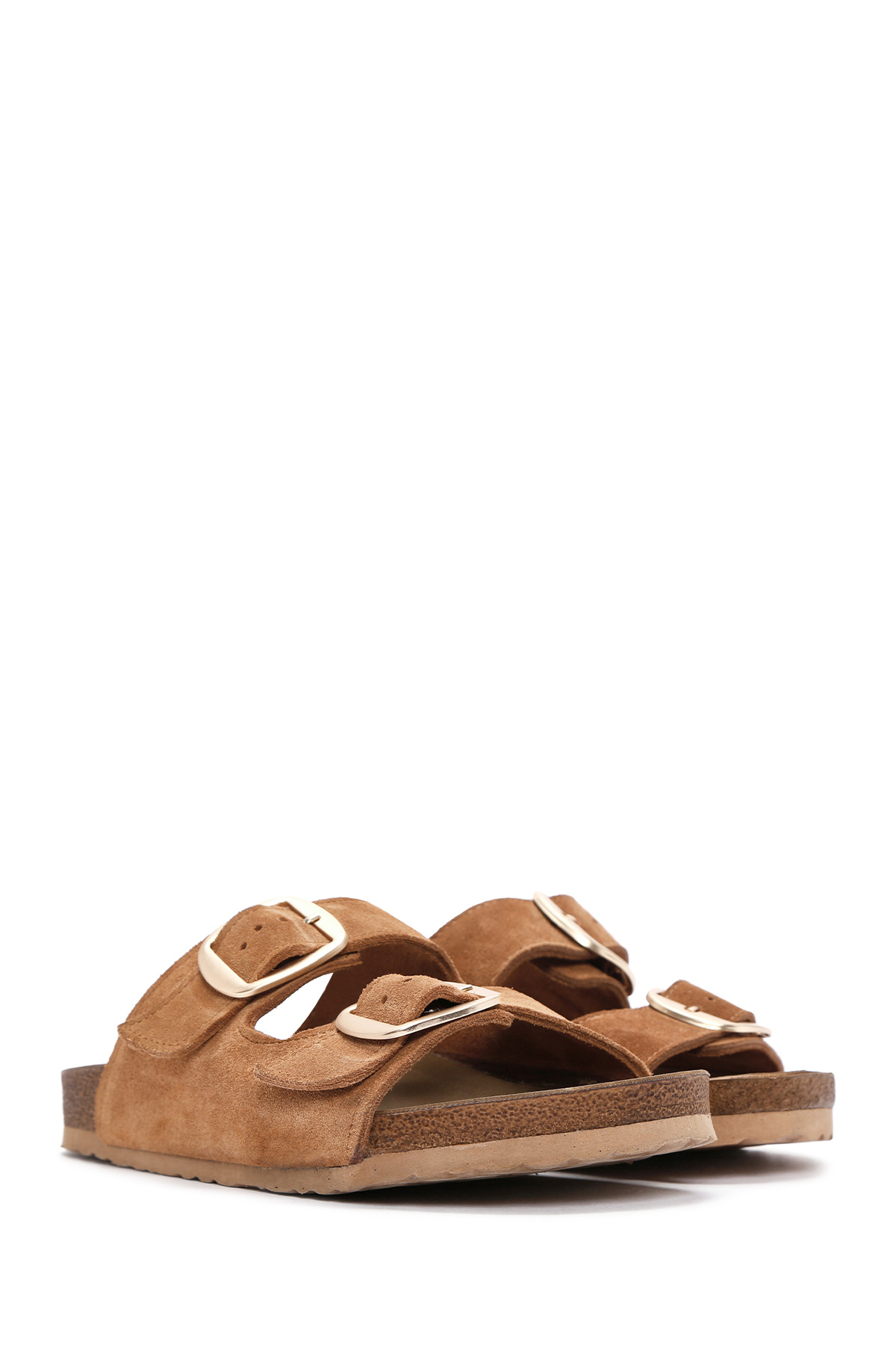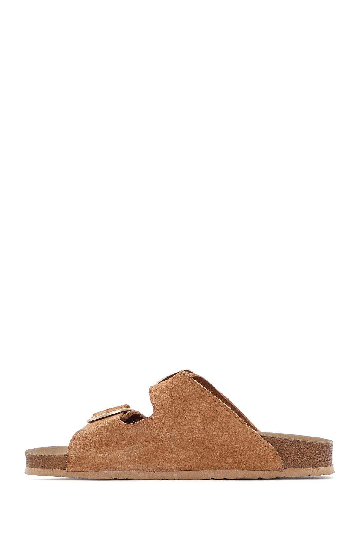 دمپایی زنانه جیر چرمی سگکدار قهوهای روشن حاوی چرم گاوی است.