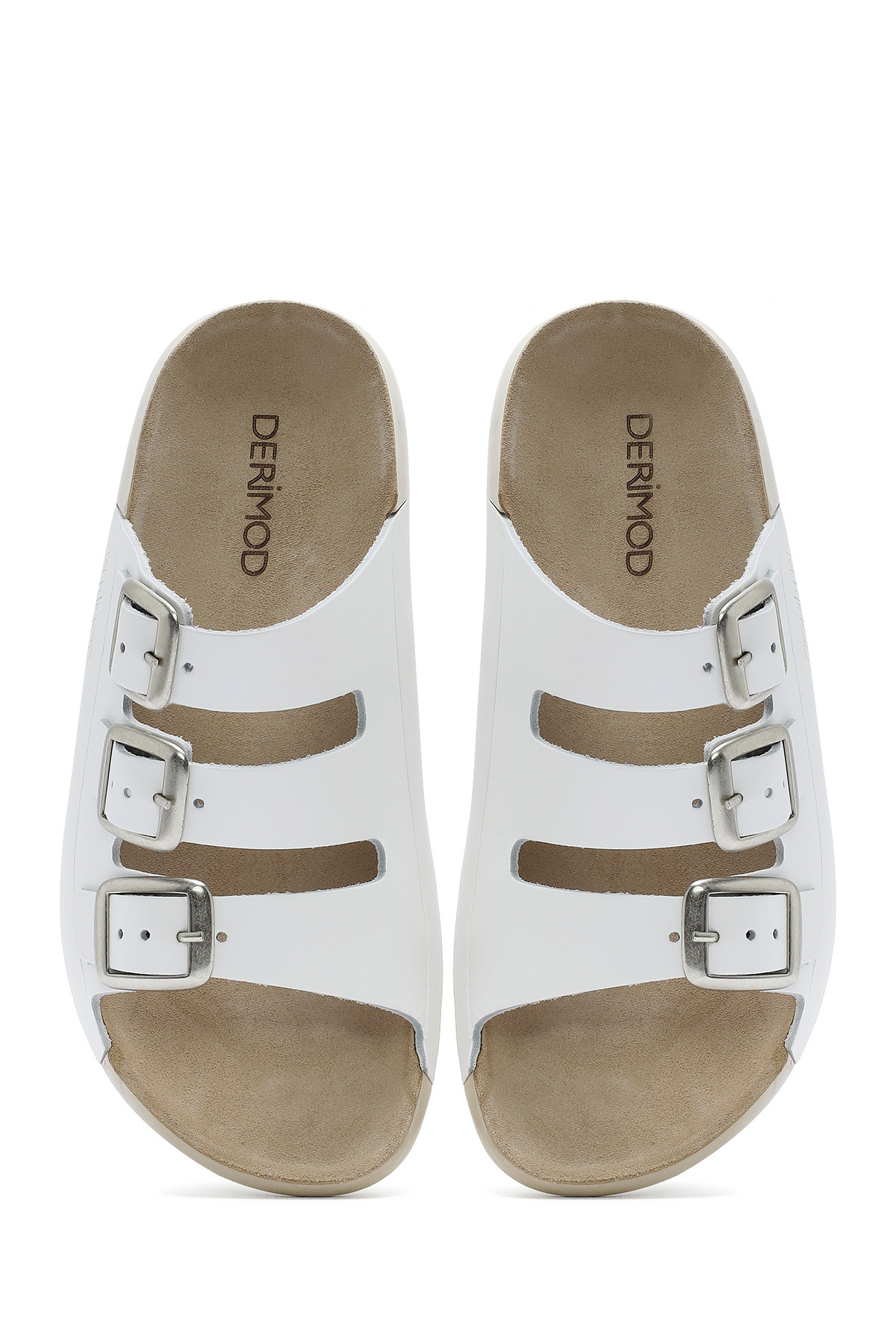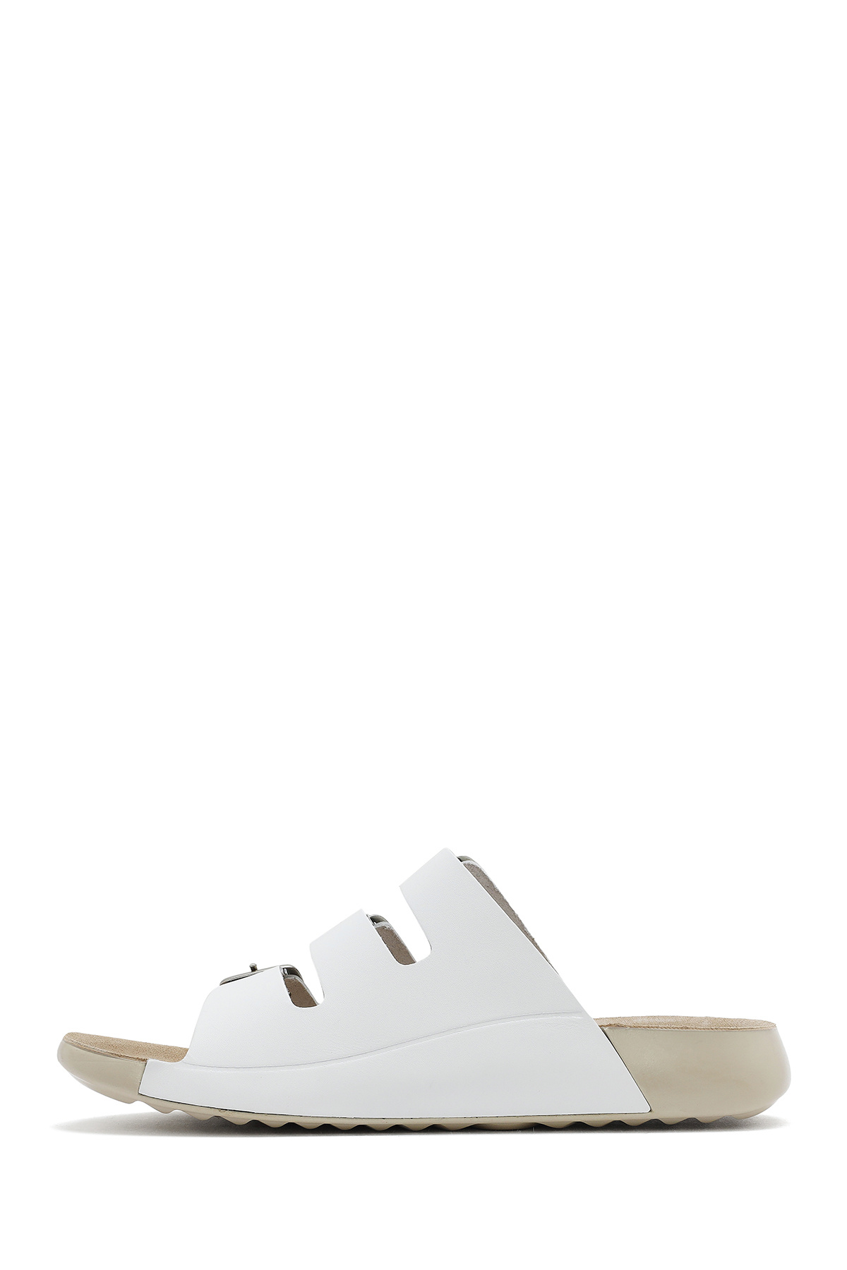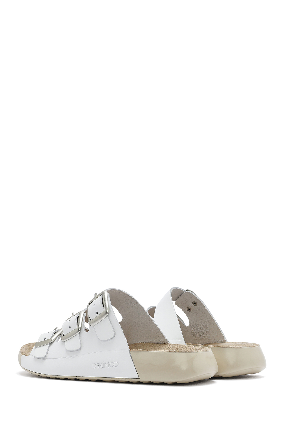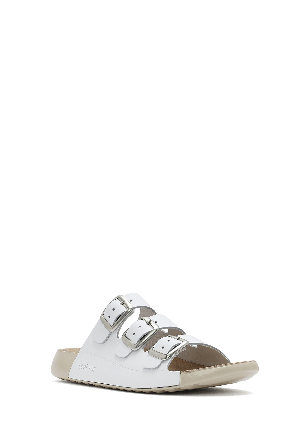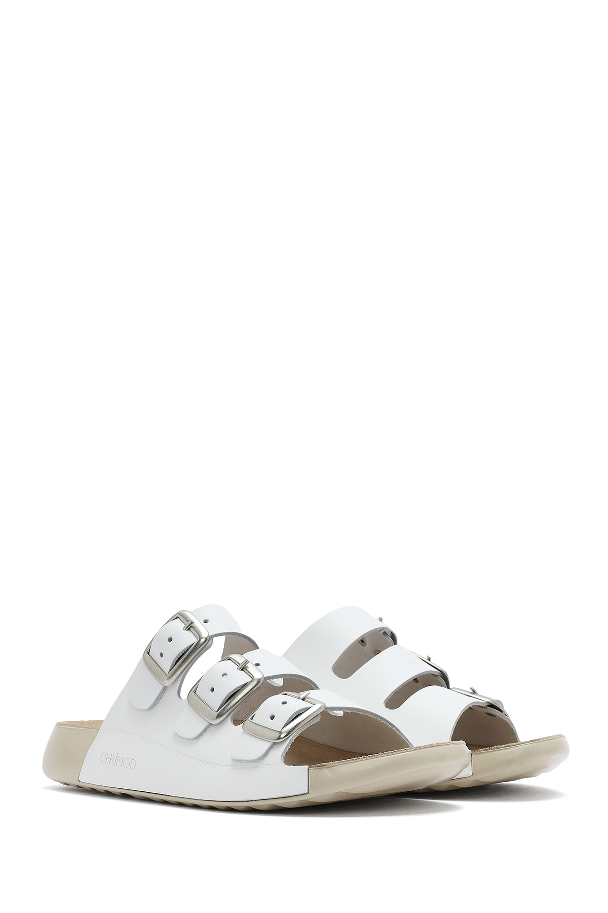 دمپایی راحتی زنانه چرم سگک دار سفید حاوی چرم گاوی است.