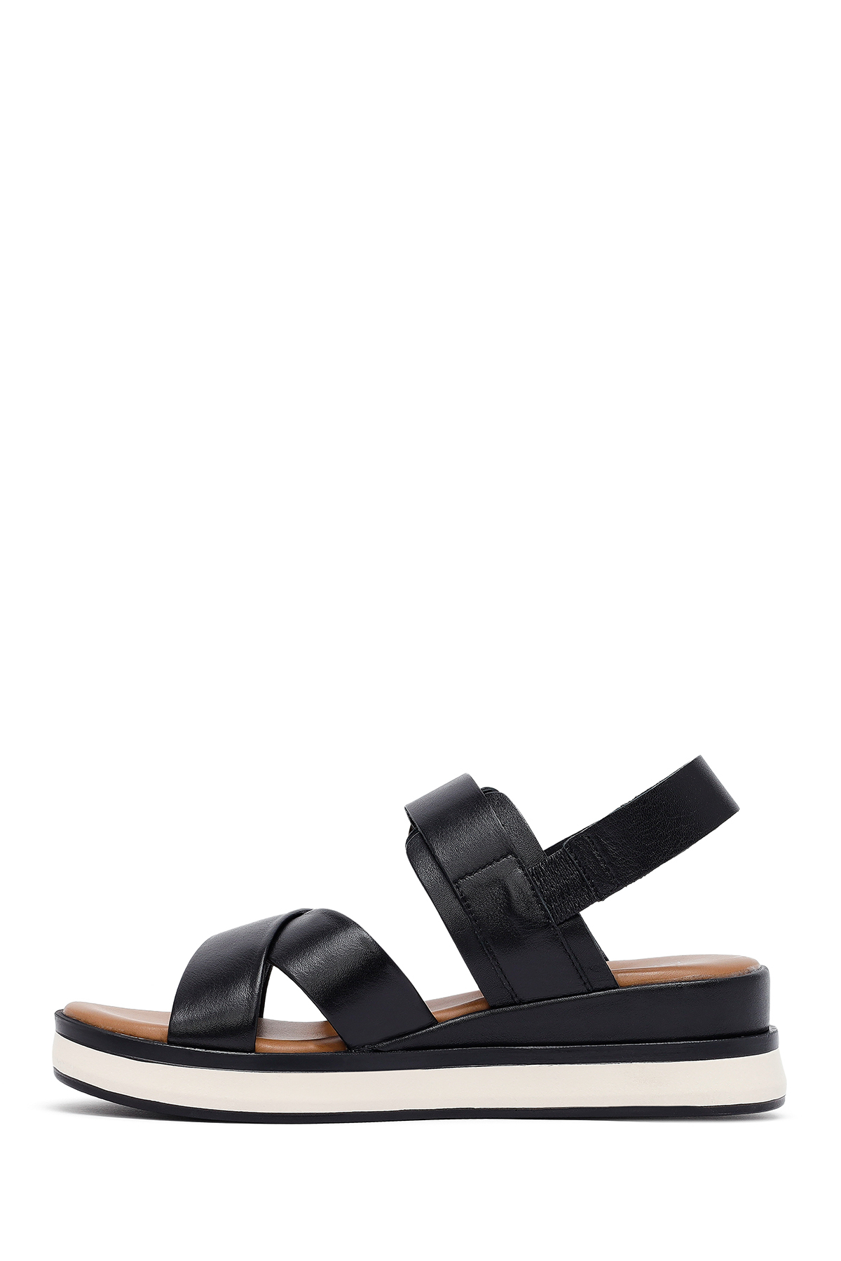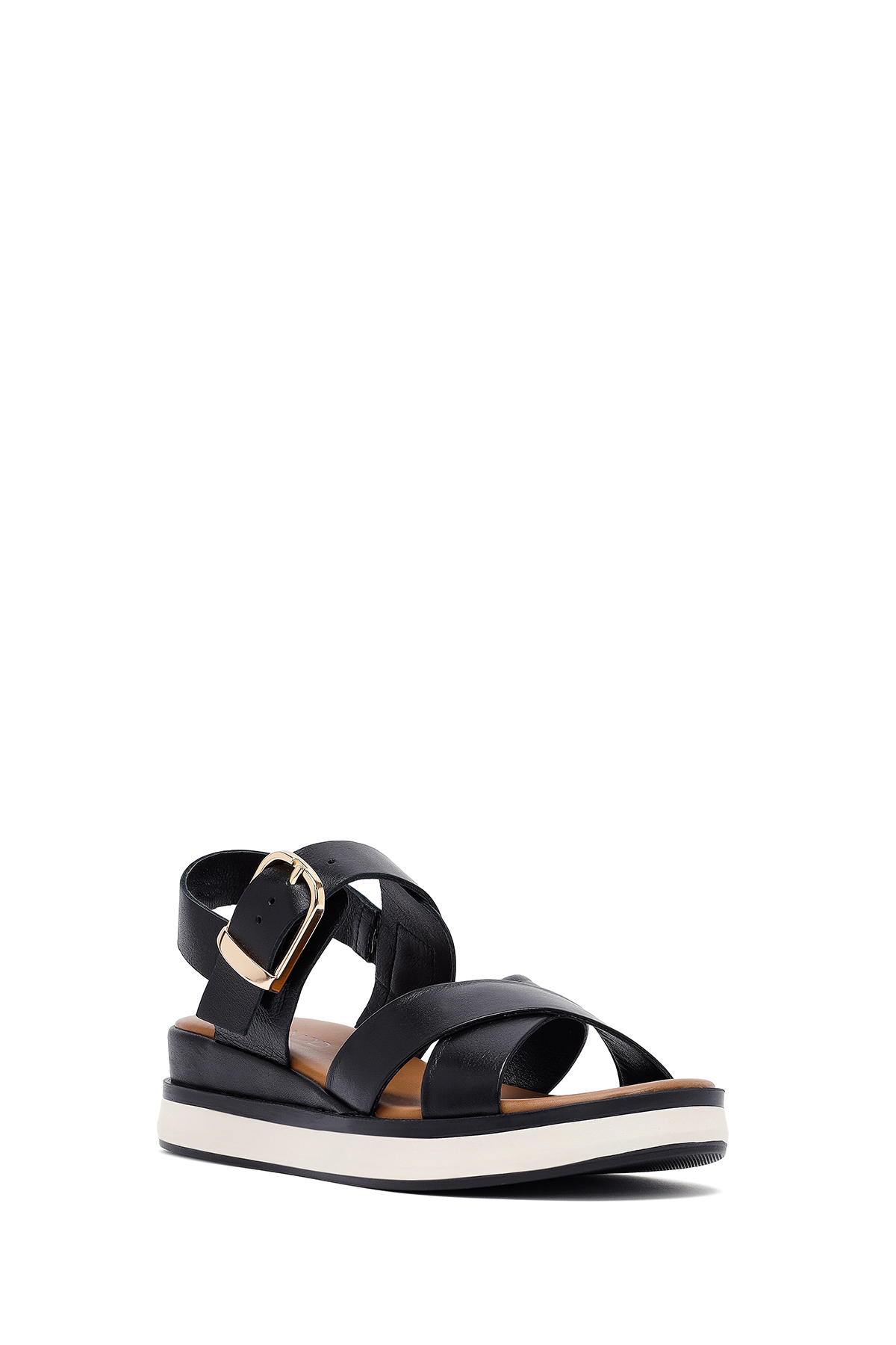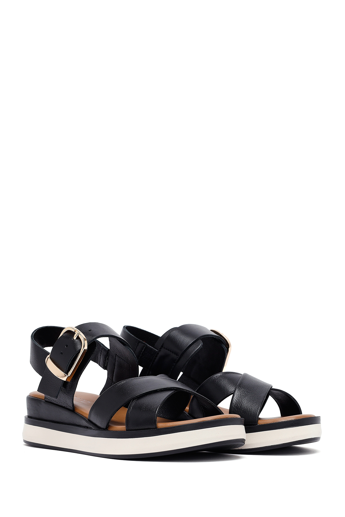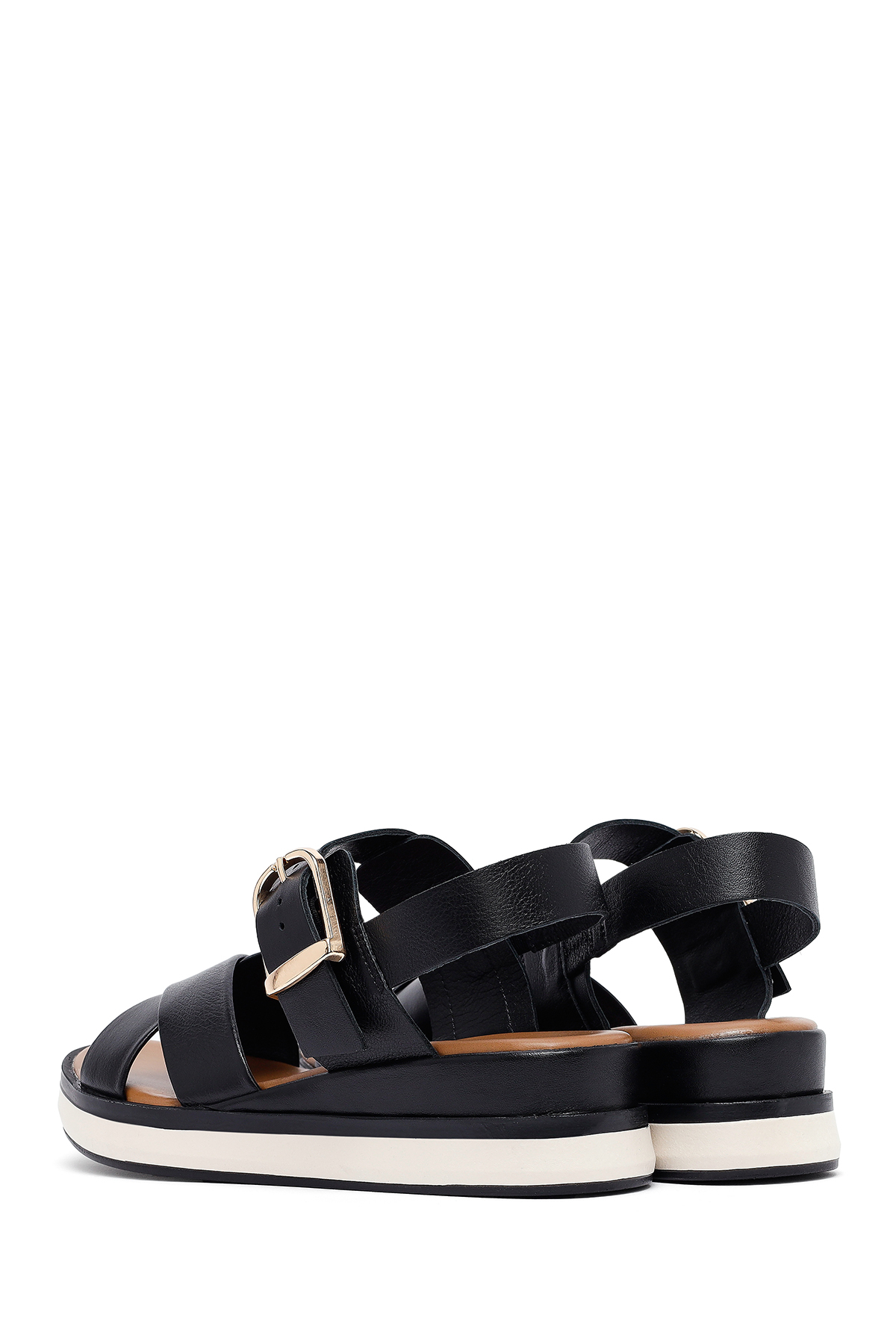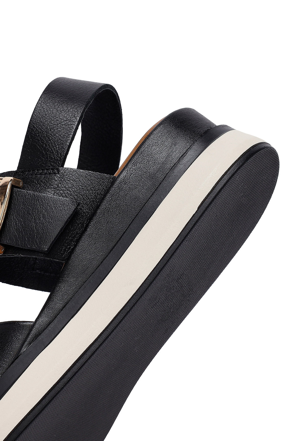 این صندلهای چرمی زنانه مشکی با سگک مچ پا و کف ضخیم، دارای چرم گاوی هستند.