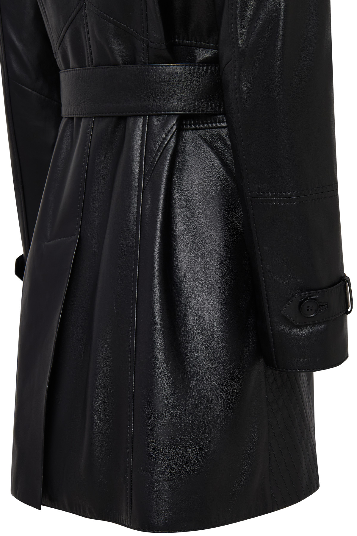 پالتوی چرمی مشکی زنانه والریا با یقه خز و جزئیات کمربند حاوی پوست گوسفند است.
