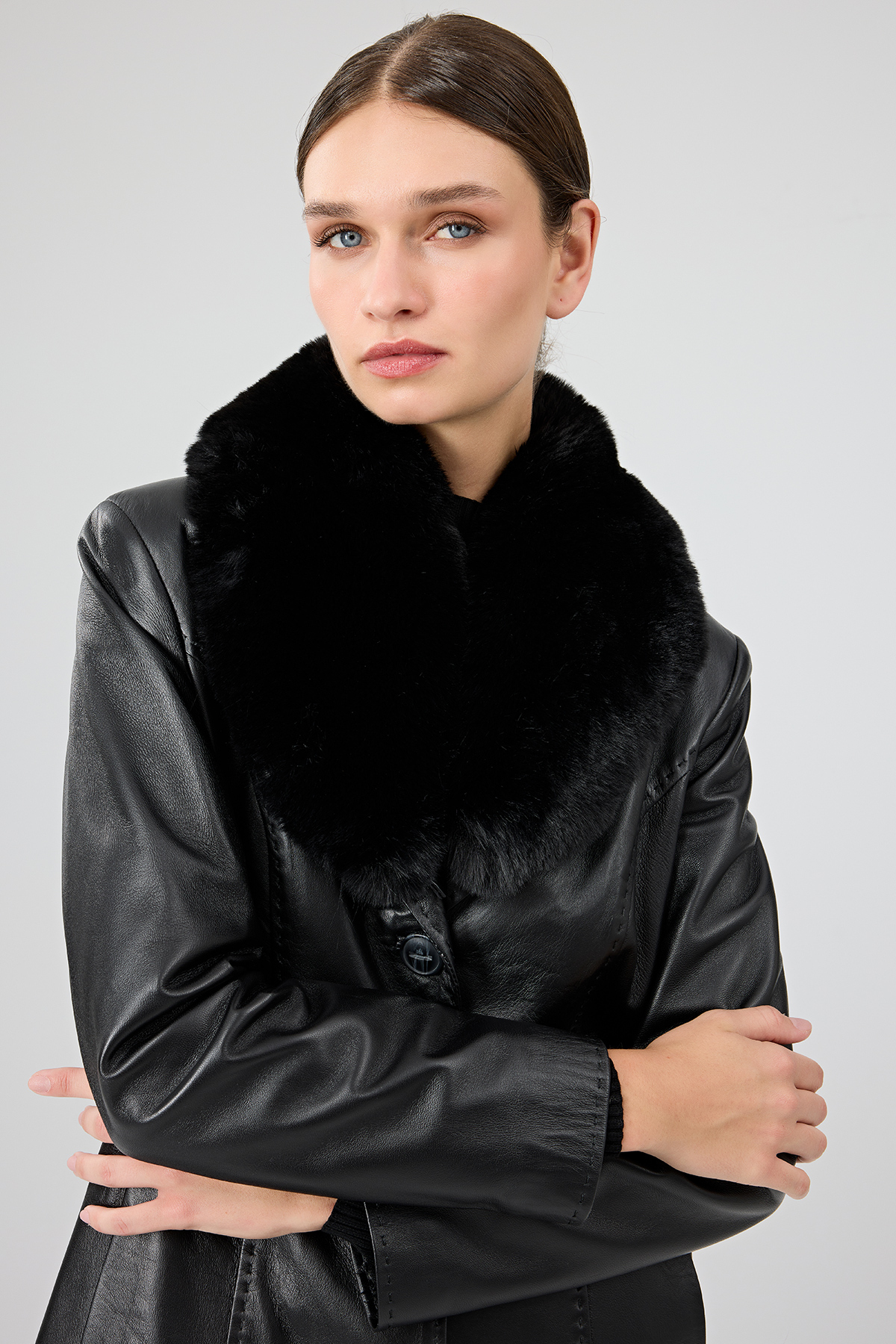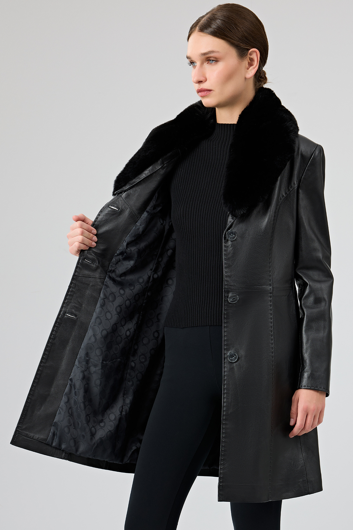 پالتوی بلند چرمی زنانه کریستینا با خز مشکی، حاوی پوست گوسفند است.