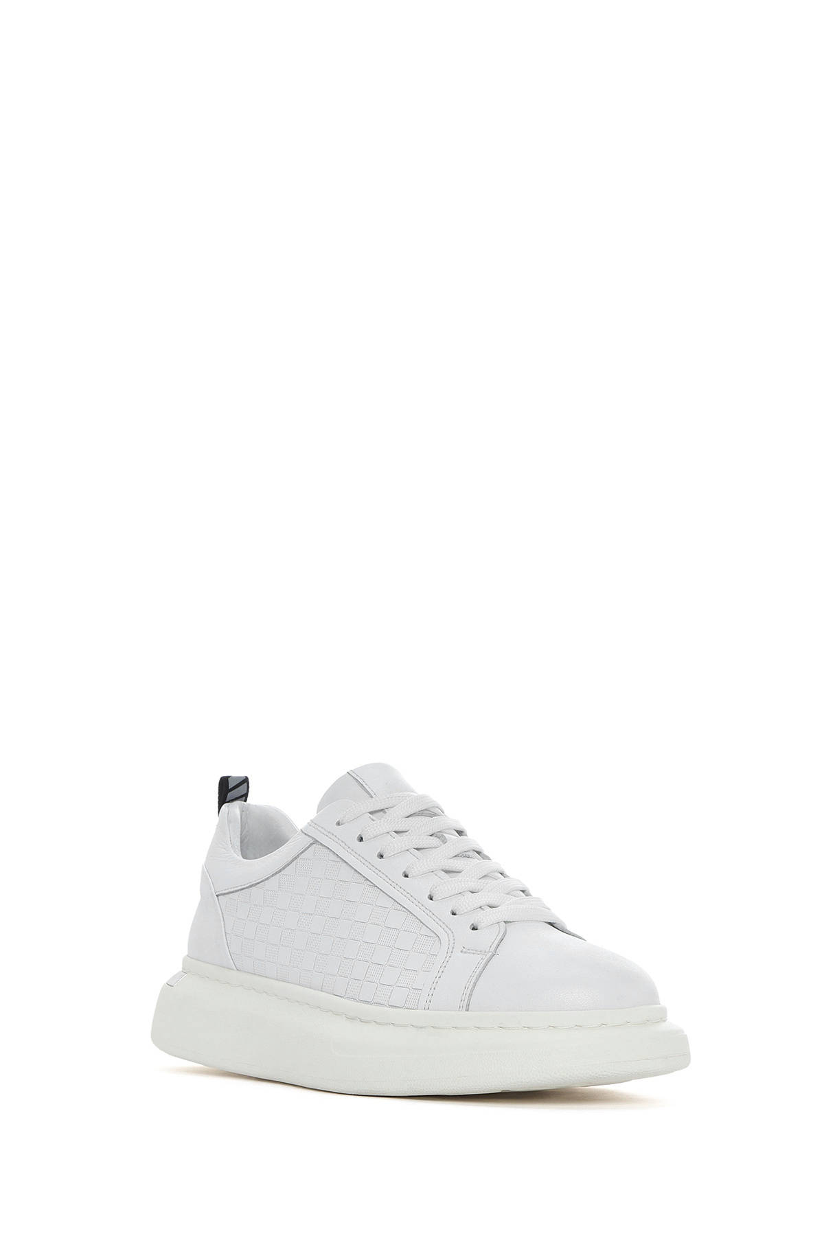 کفش کتانی مردانه چرم سفید بنددار با کفی ضخیم، دارای چرم گاوی.