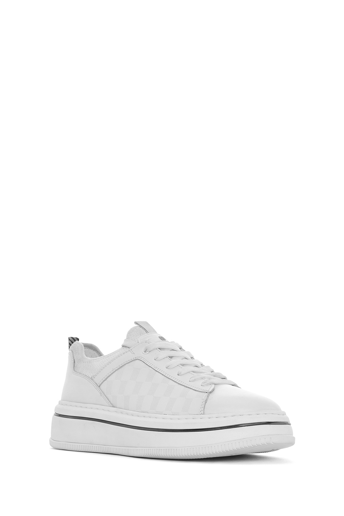 کفش کتانی مردانه چرم سفید بنددار با کفی ضخیم، دارای چرم گاوی.