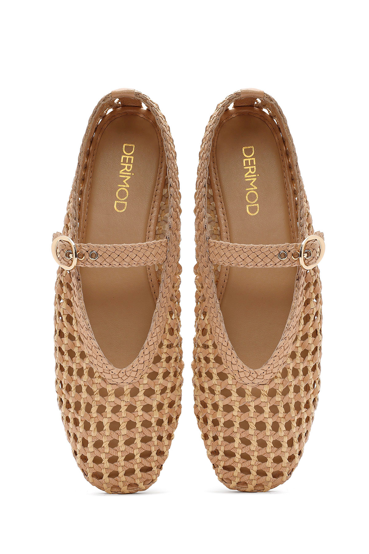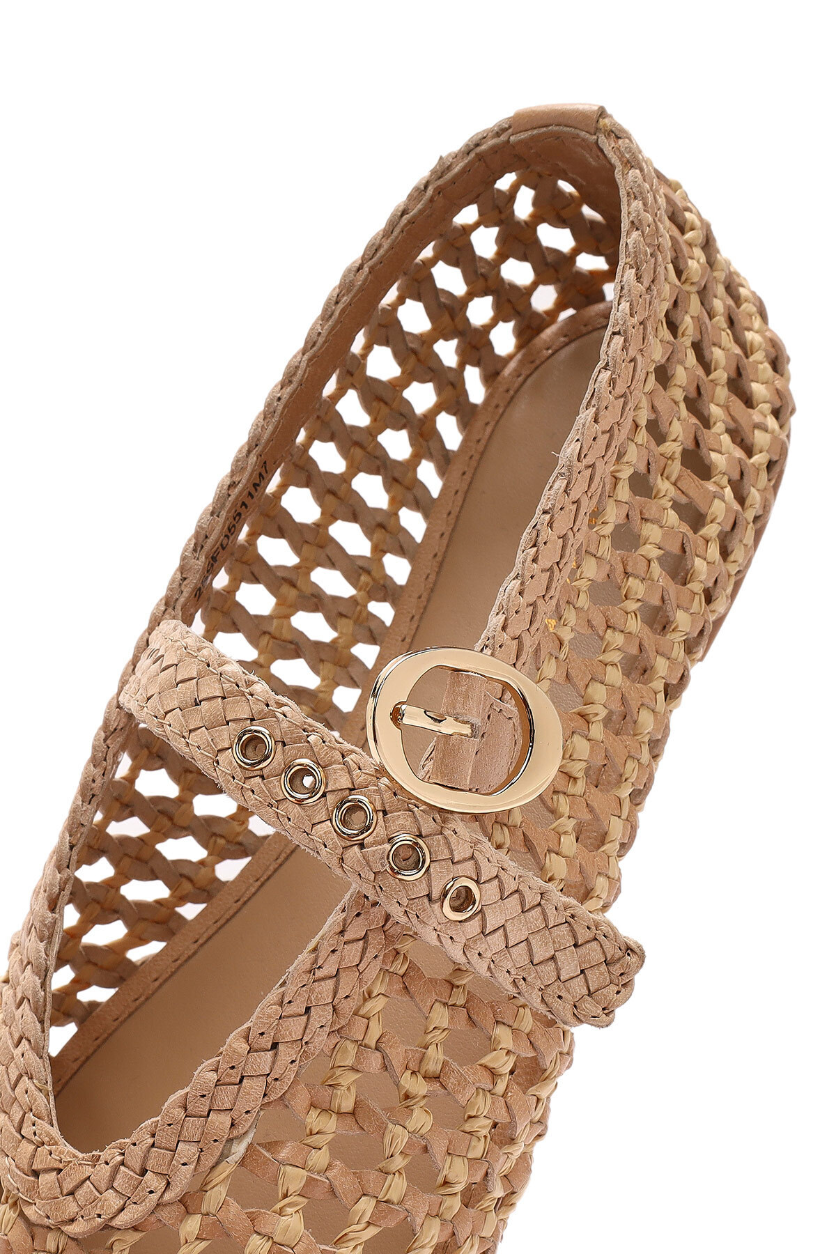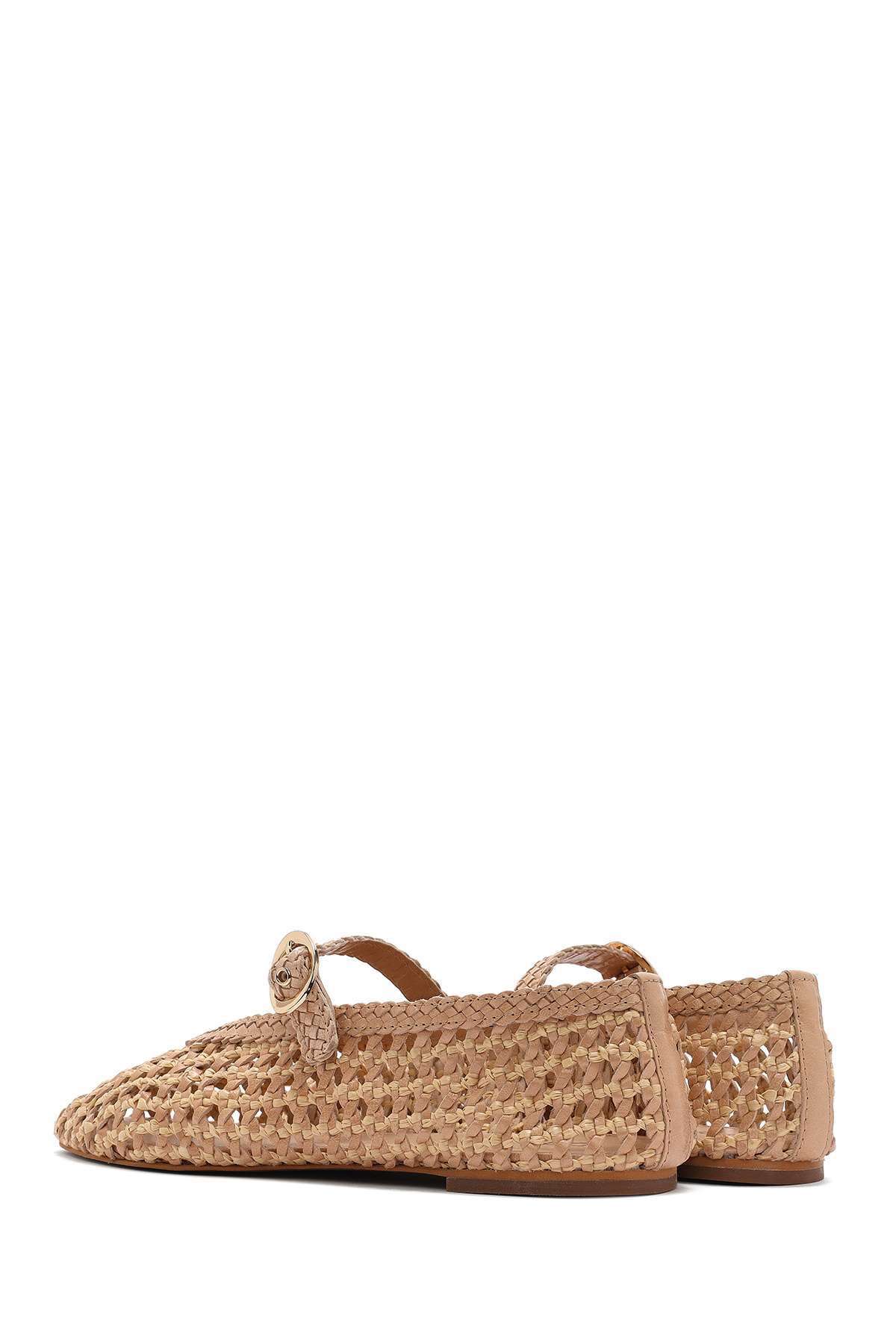 کفشهای باله زنانه چرم حصیری سگکدار بژ حاوی چرم گاوی هستند.