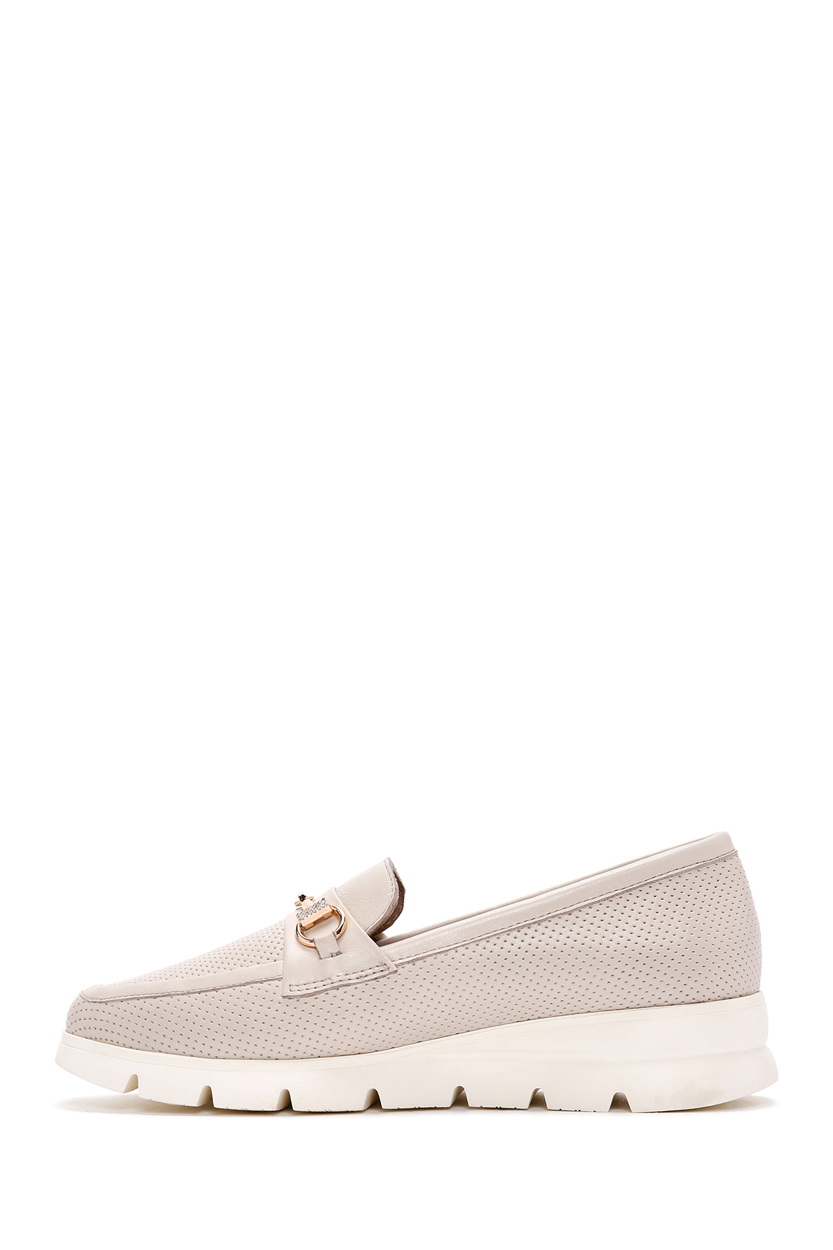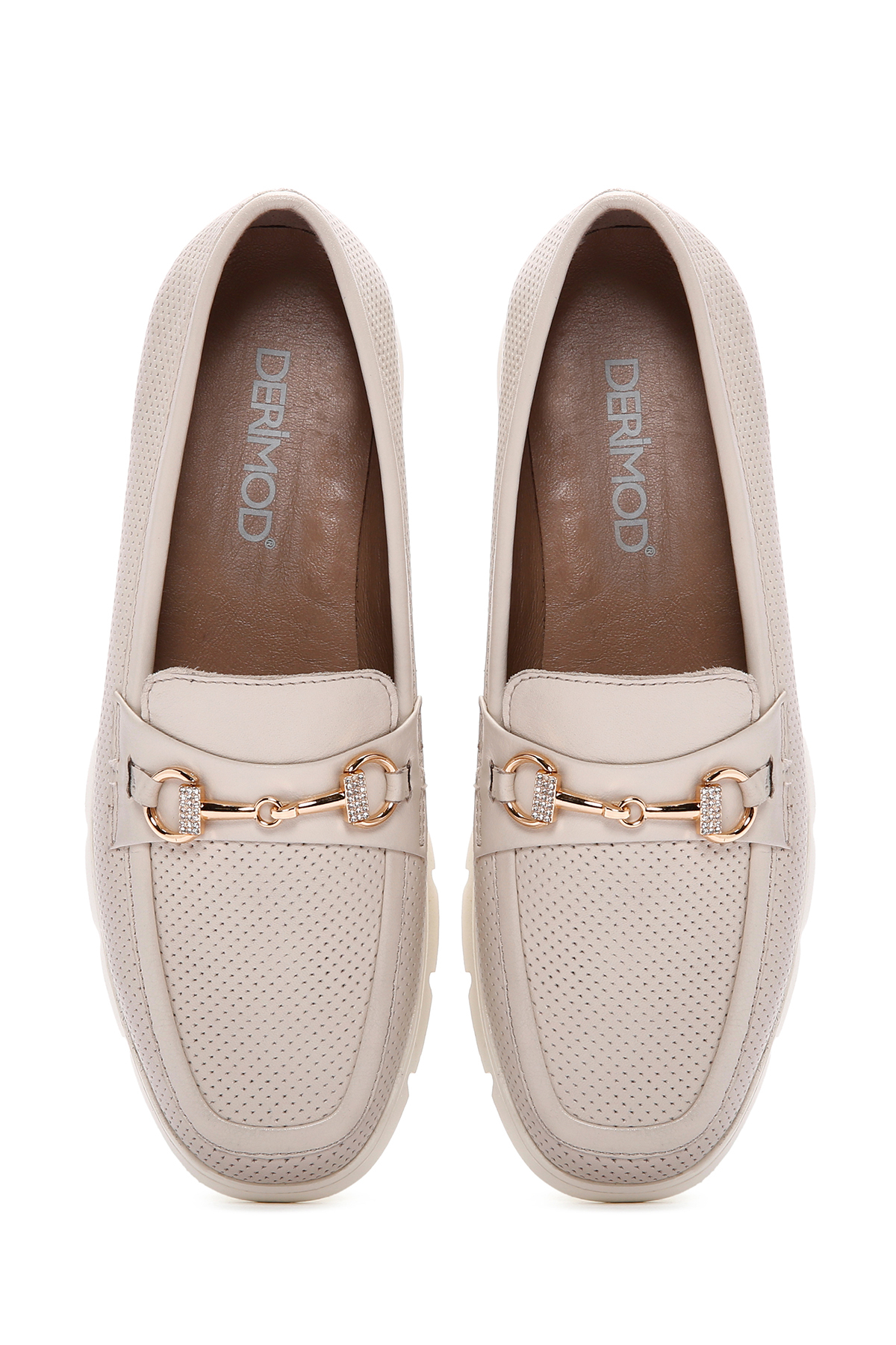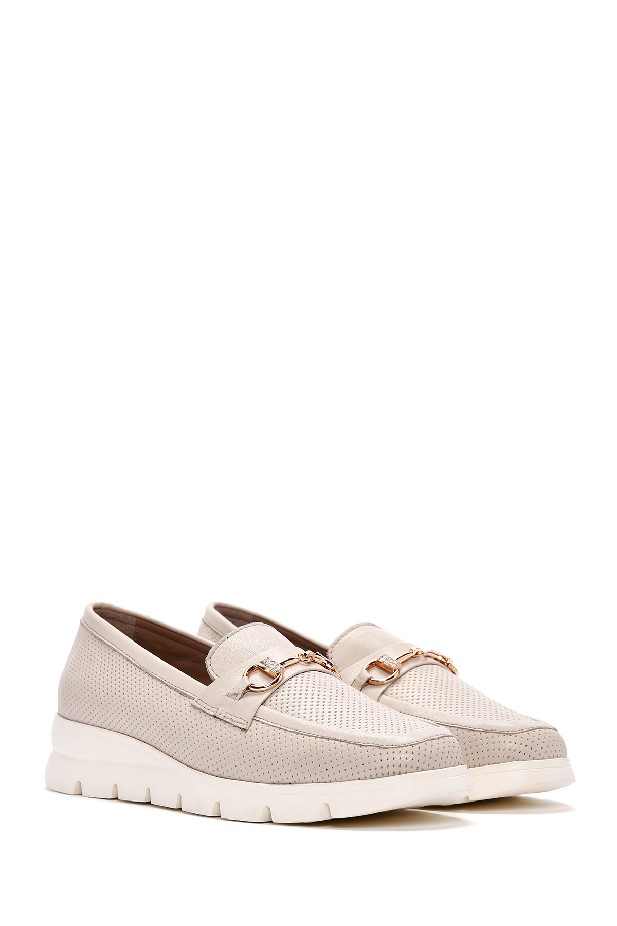 کفش راحتی زنانه چرم مدل لژدار سگک دار به رنگ کرم، از چرم گاوی ساخته شده است.