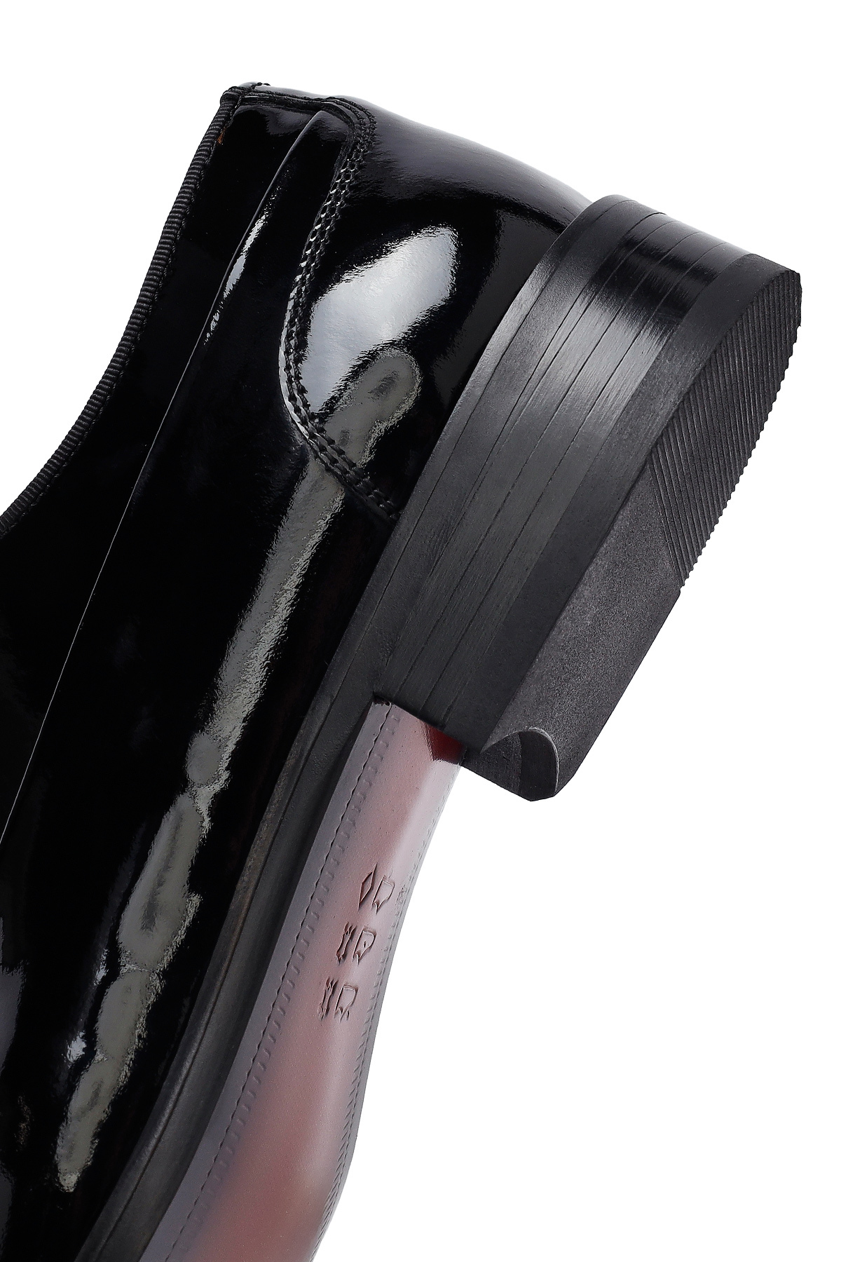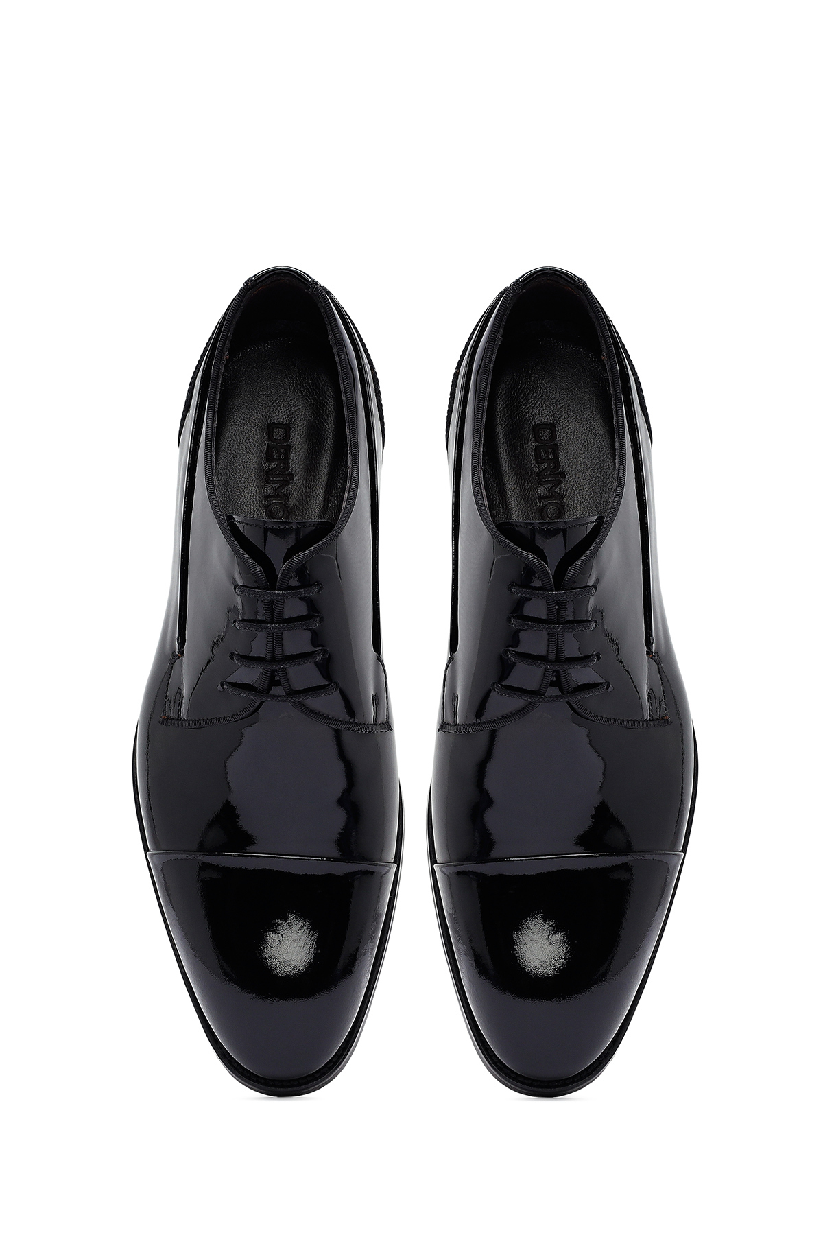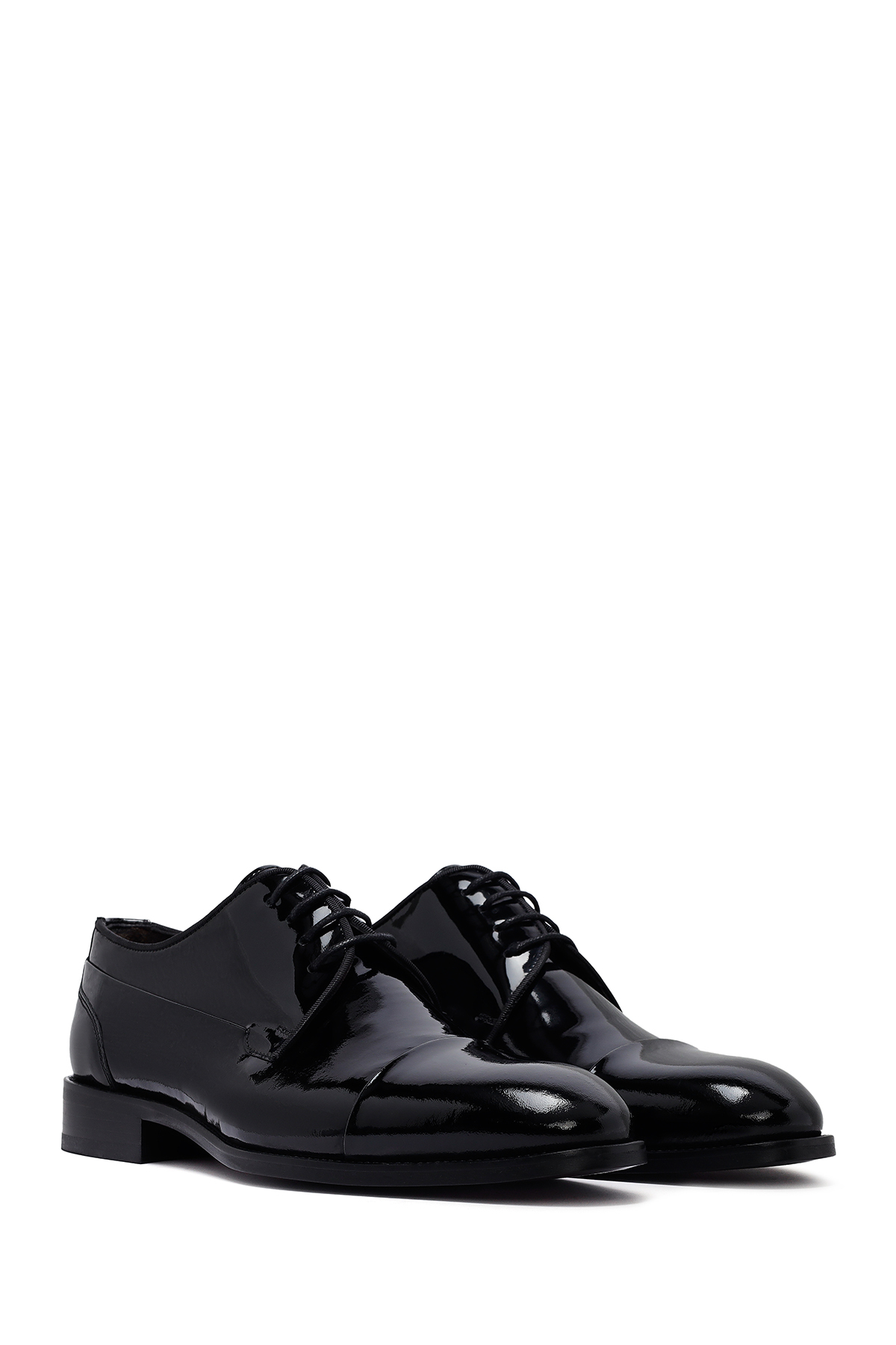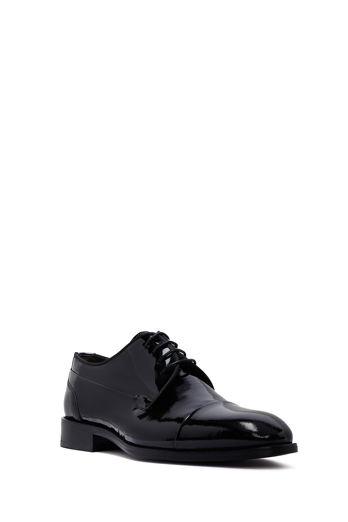 کفشهای کلاسیک چرم ورنی مشکی مردانه با بند، دارای چرم گاوی هستند.