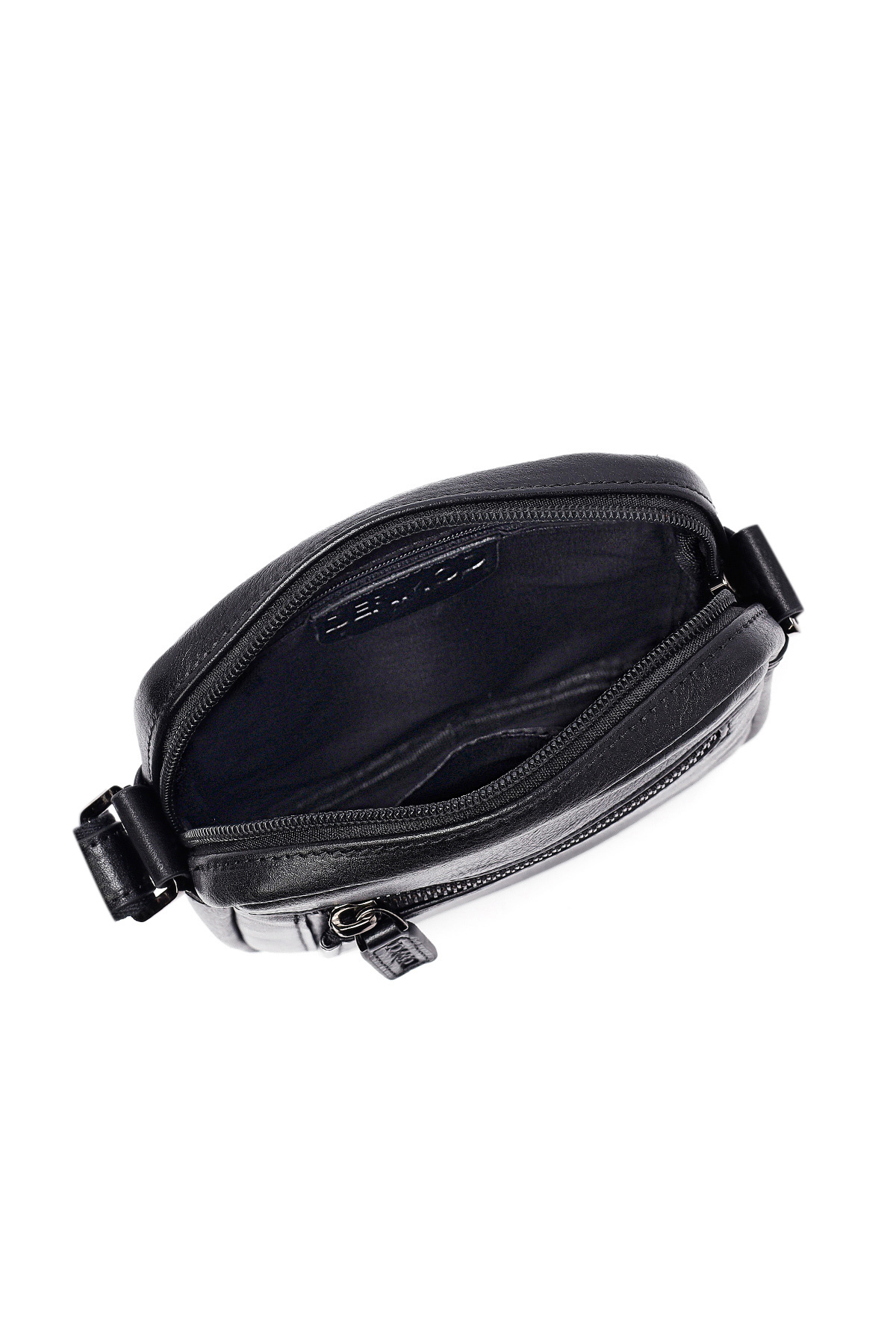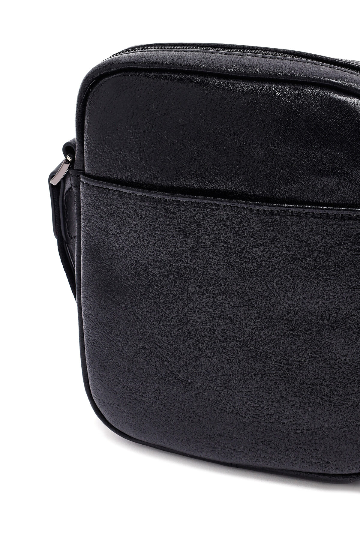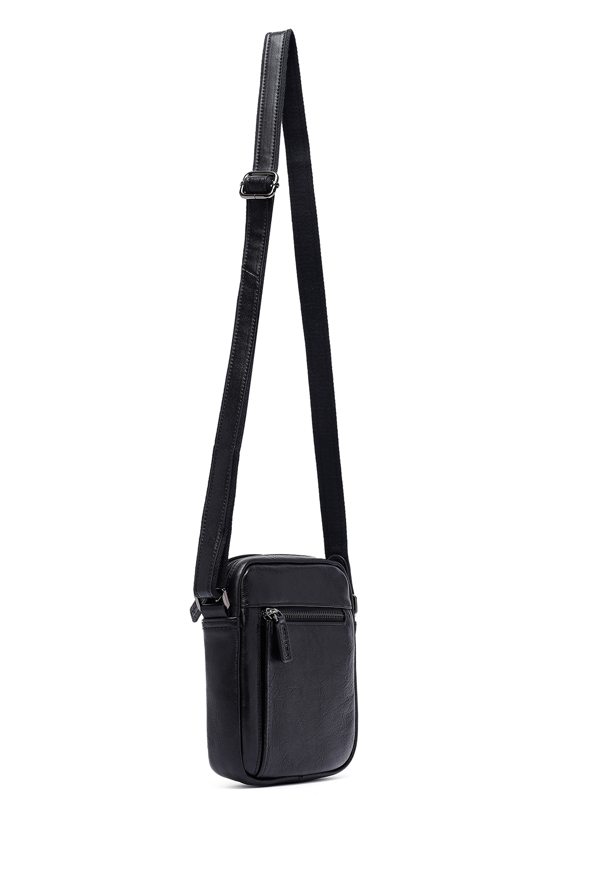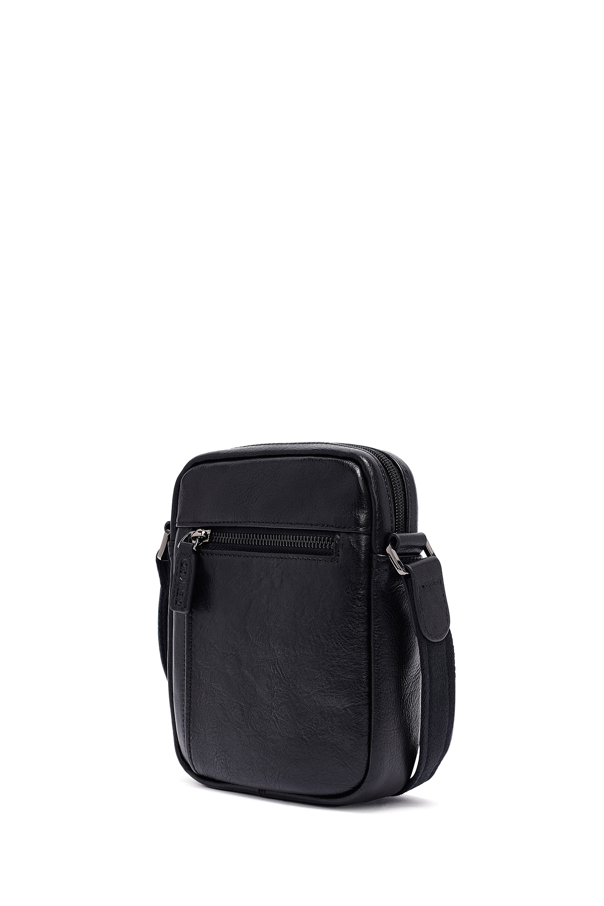 کیف دوشی مردانه بند بلند مشکی طرح چرم گاوی، از چرم گاوی ساخته شده است.