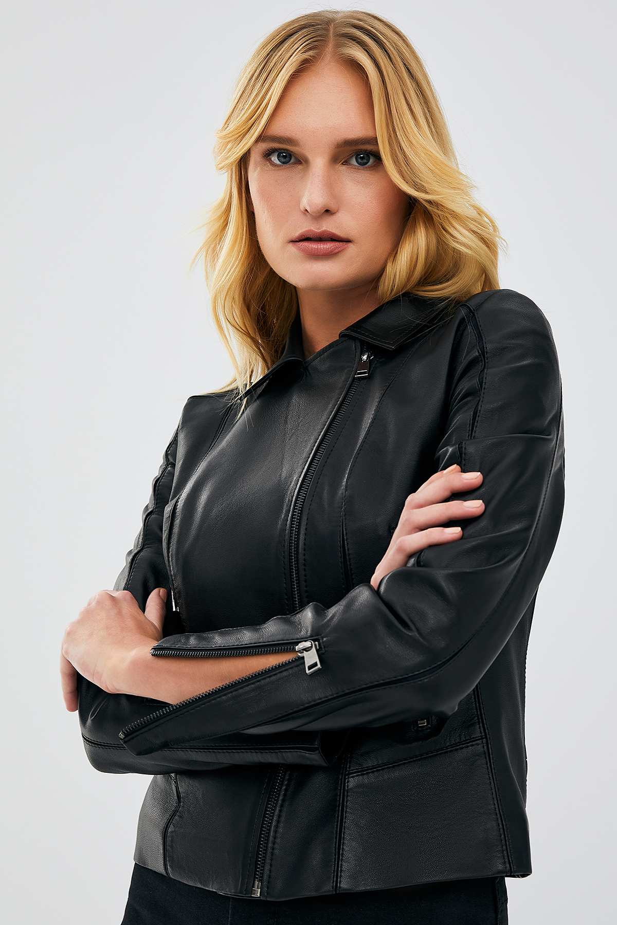 کاپشن چرمی موتورسواری زنانه کیارا مشکی و اسلیم فیت، دارای پوست گوسفند است.