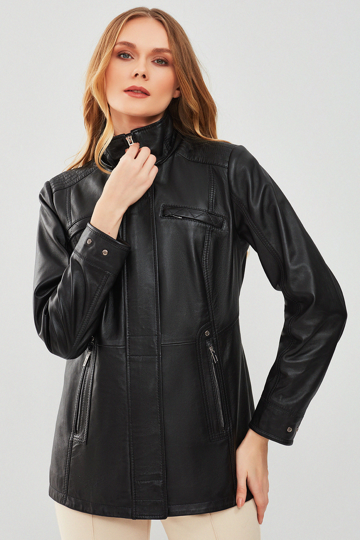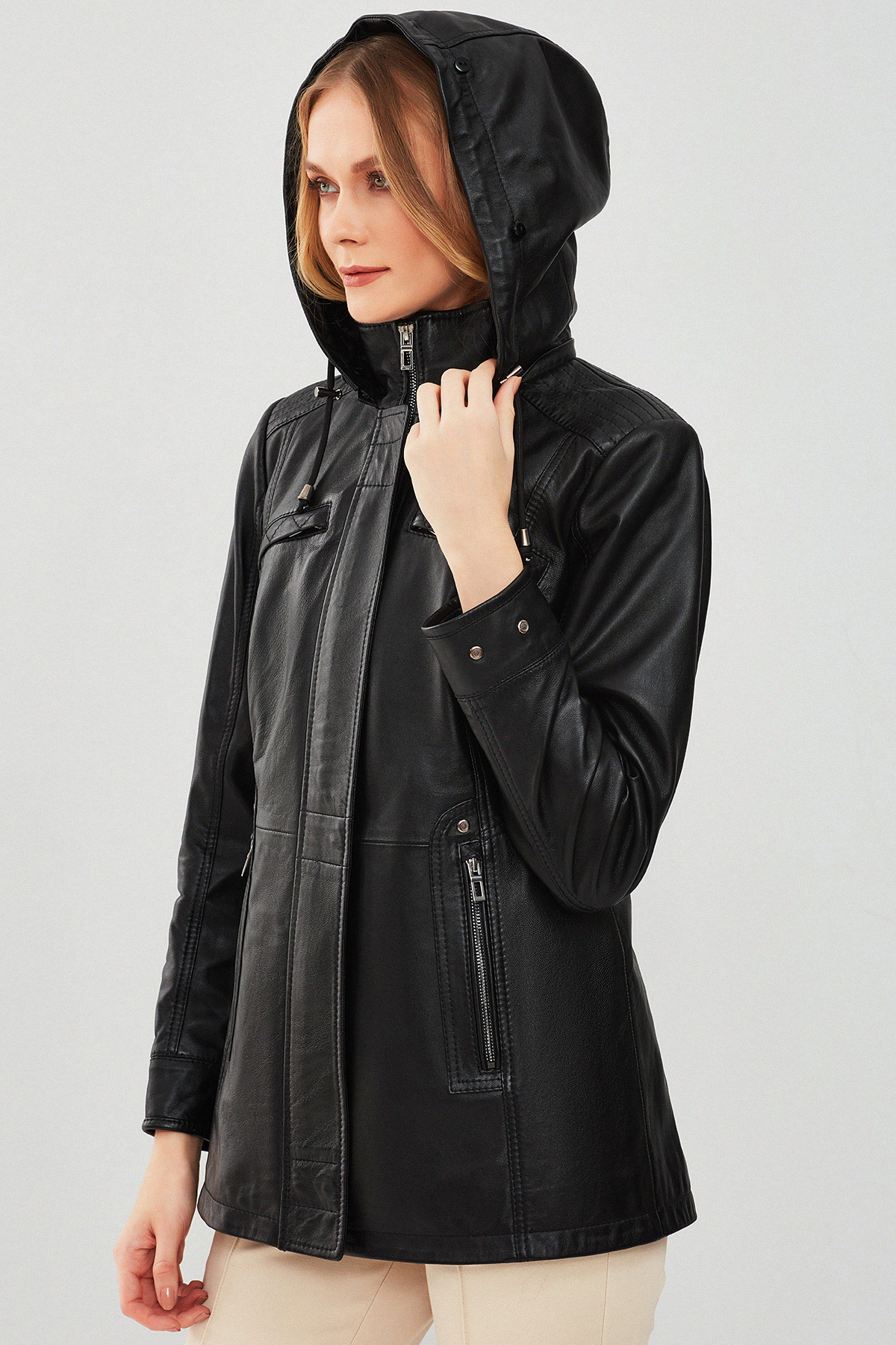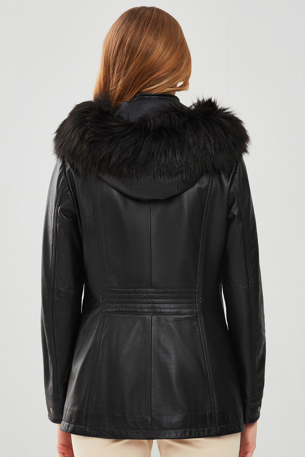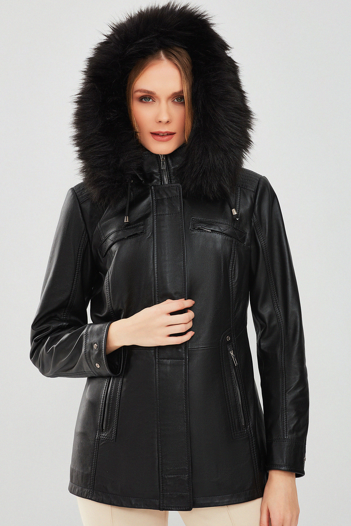 کت چرمی زنانه کلاهدار مشکی با آستر خز بتی، کد 23WGE51481M