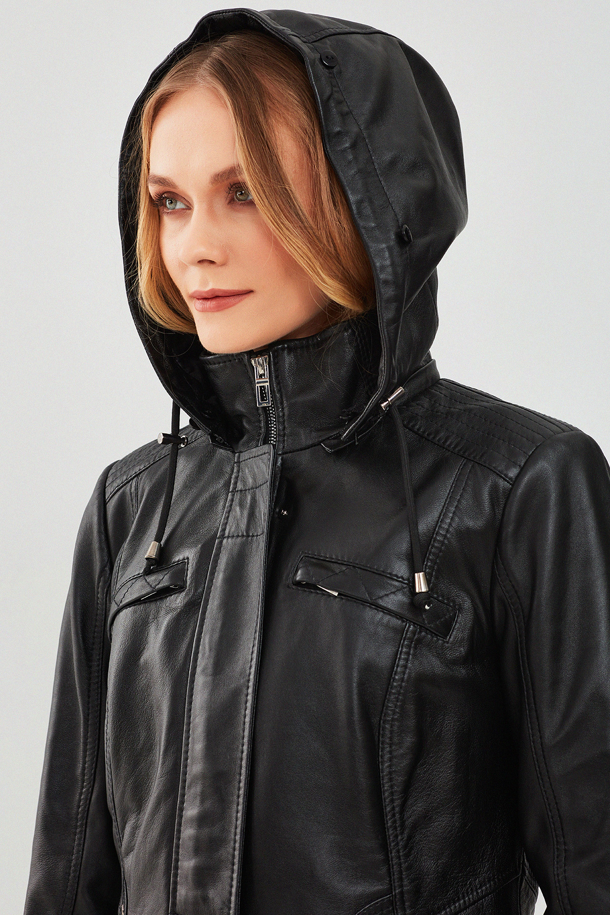 پالتوی چرمی زنانه کلاهدار مشکی با آستر خز بتی حاوی پوست گوسفند است.