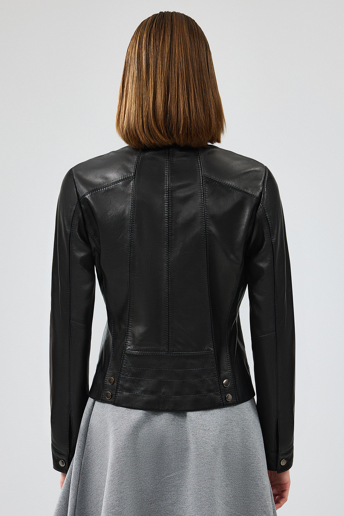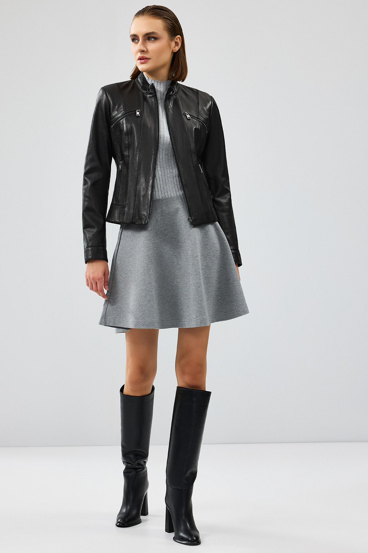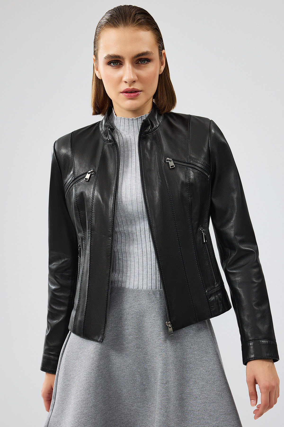 کاپشن چرمی کوتاه زنانه مشکی لیندا دارای پوست گوسفند است.