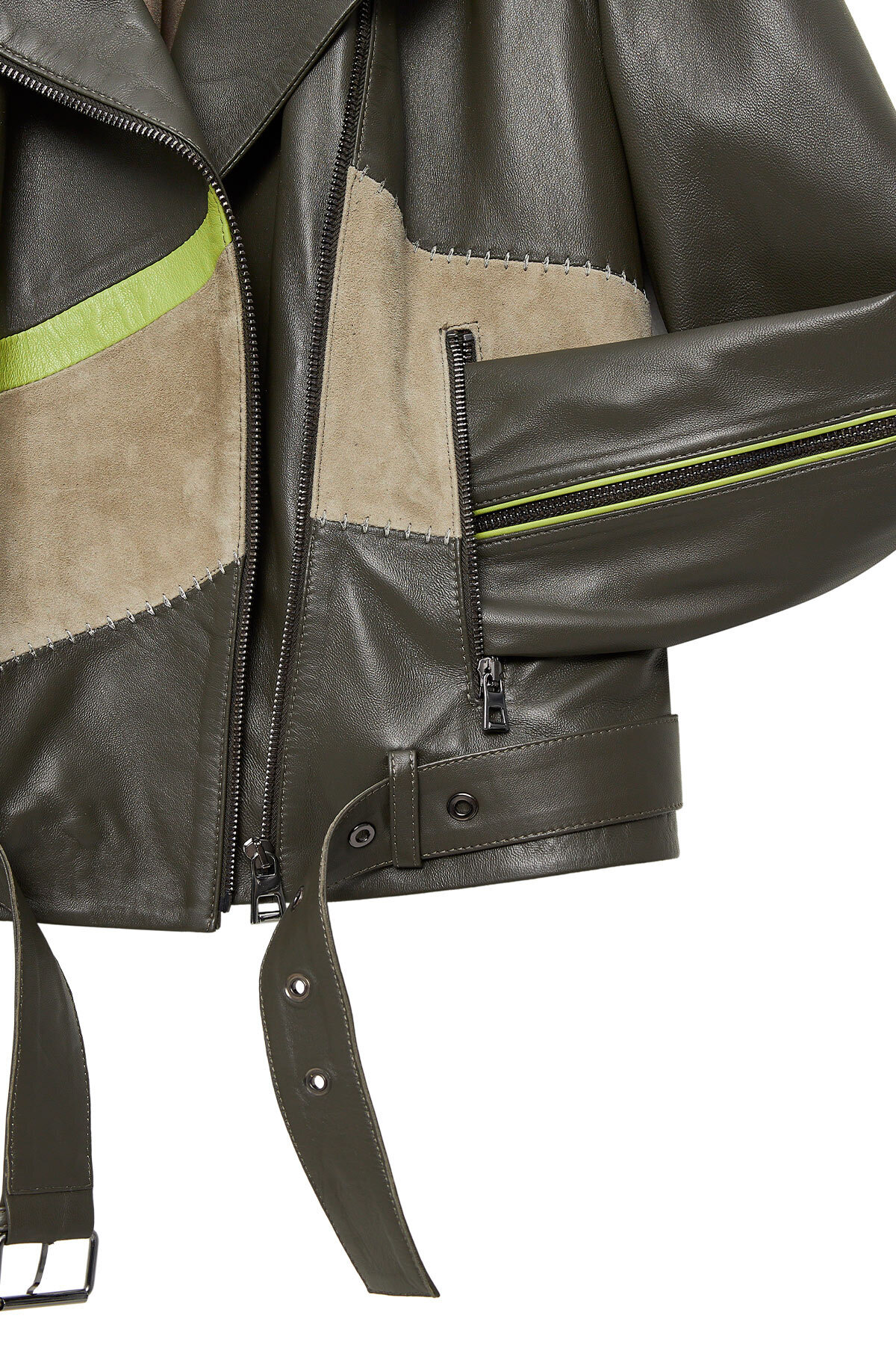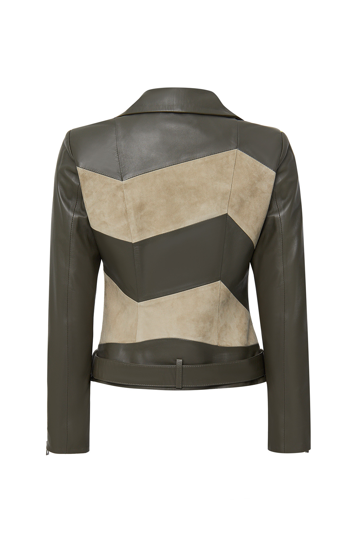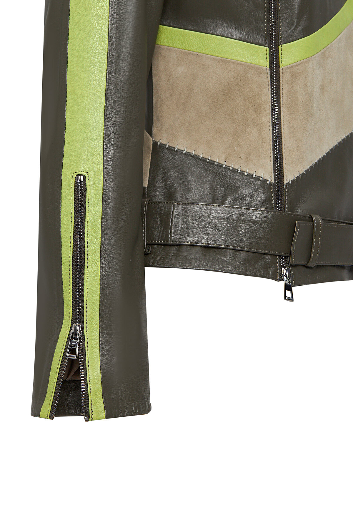 کاپشن چرم زنانه دو دکمه سبز رنگ مدونا، دارای پوست گوسفند است.