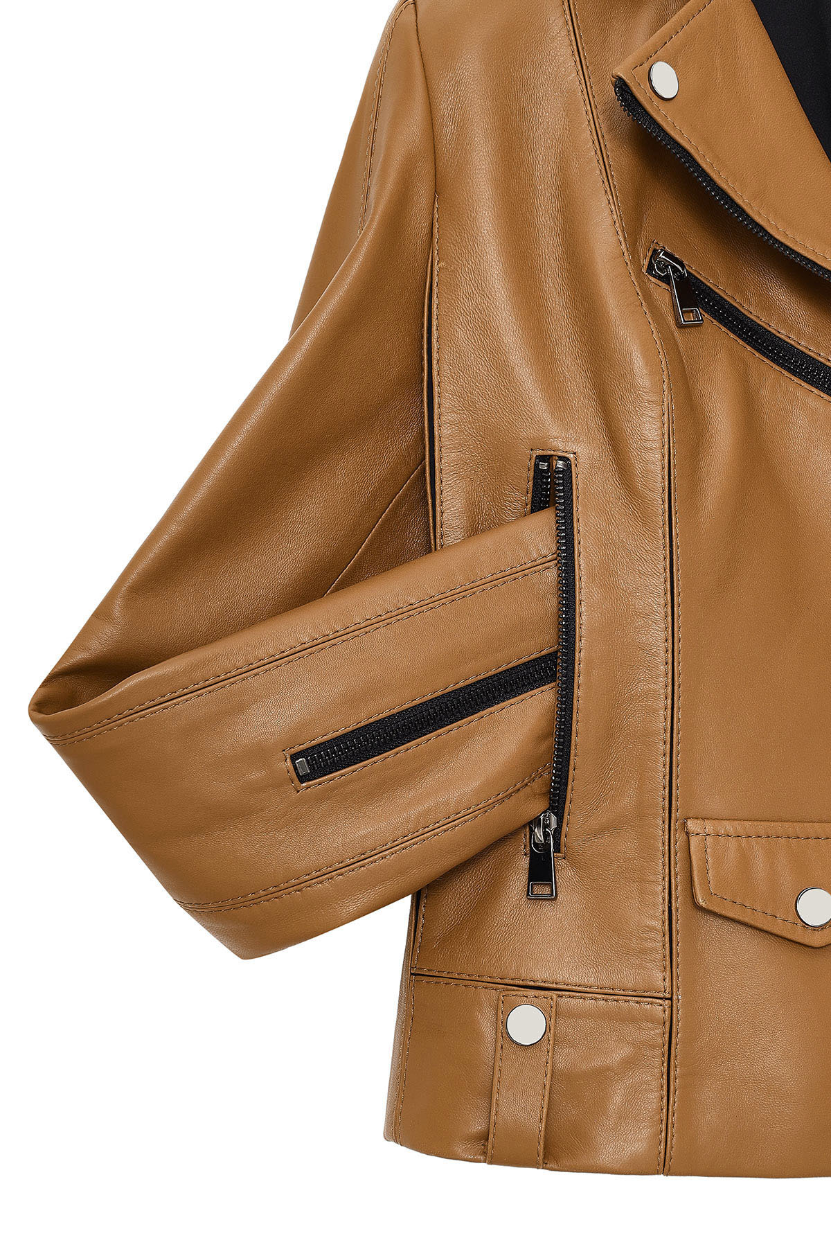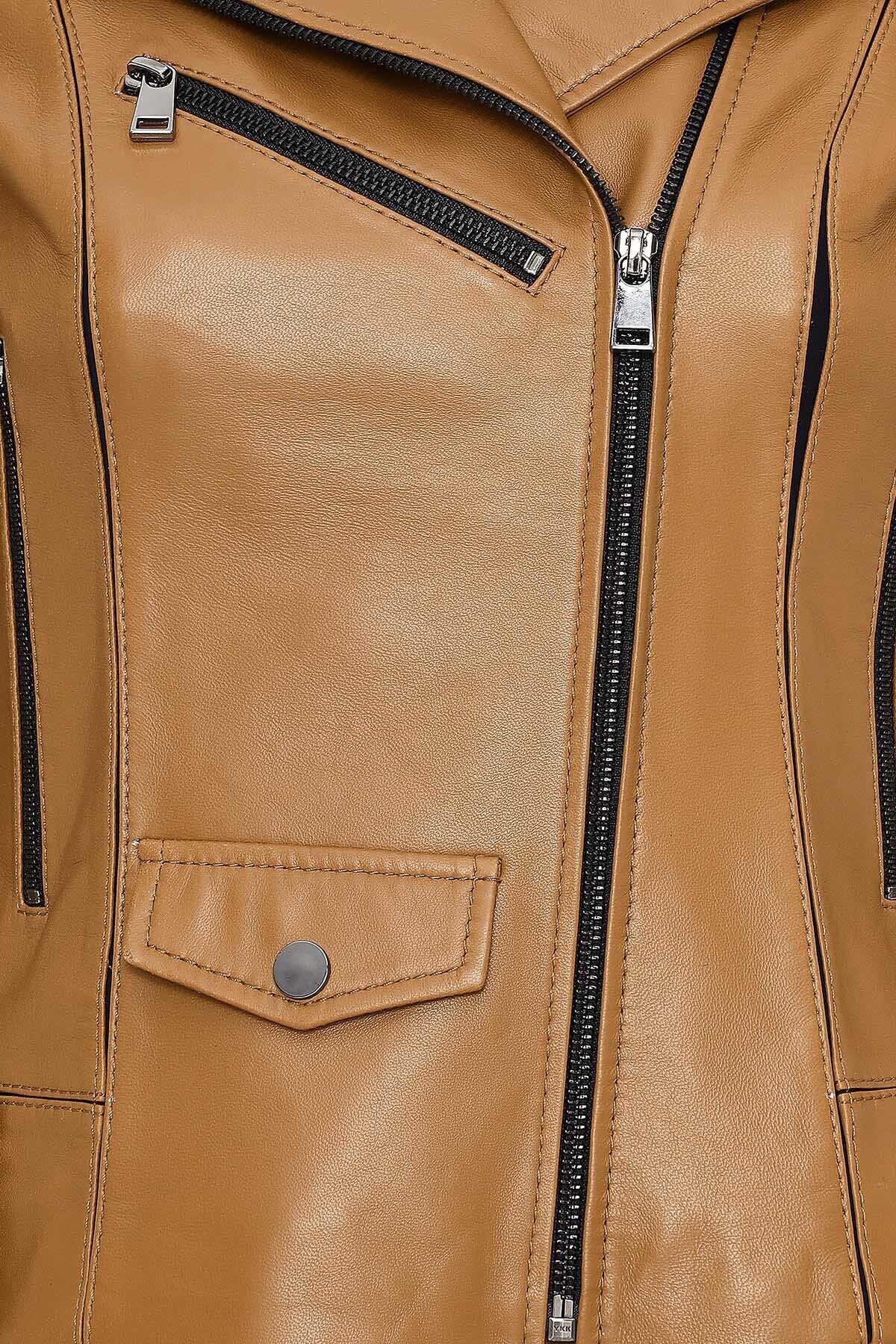 کاپشن چرمی کوتاه زنانه بلا مدل Camel Biker دارای پوست گوسفند است.