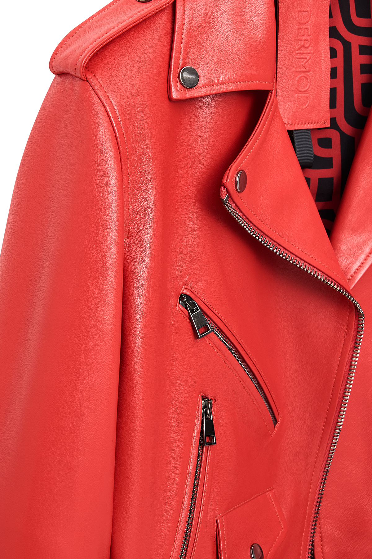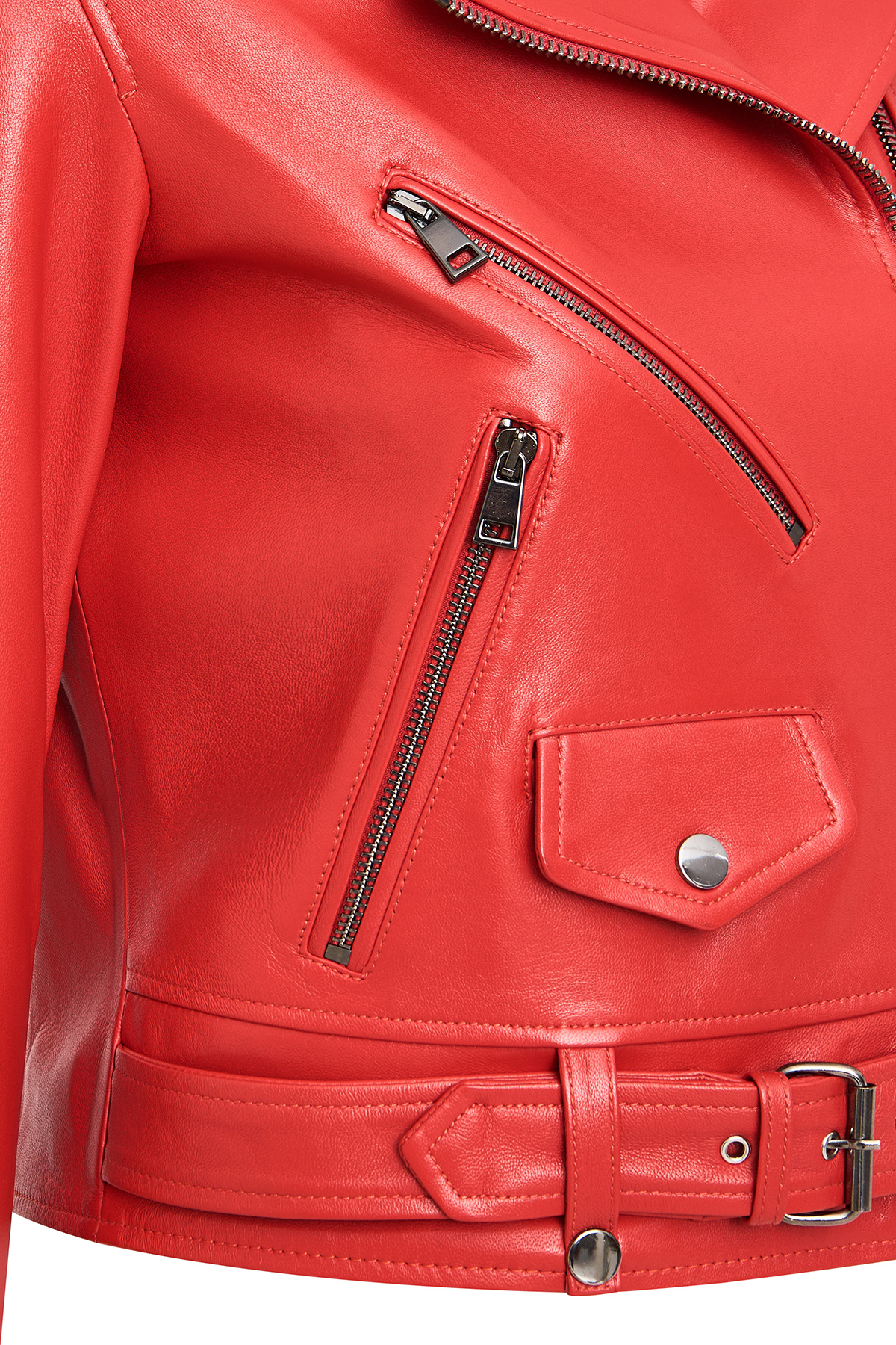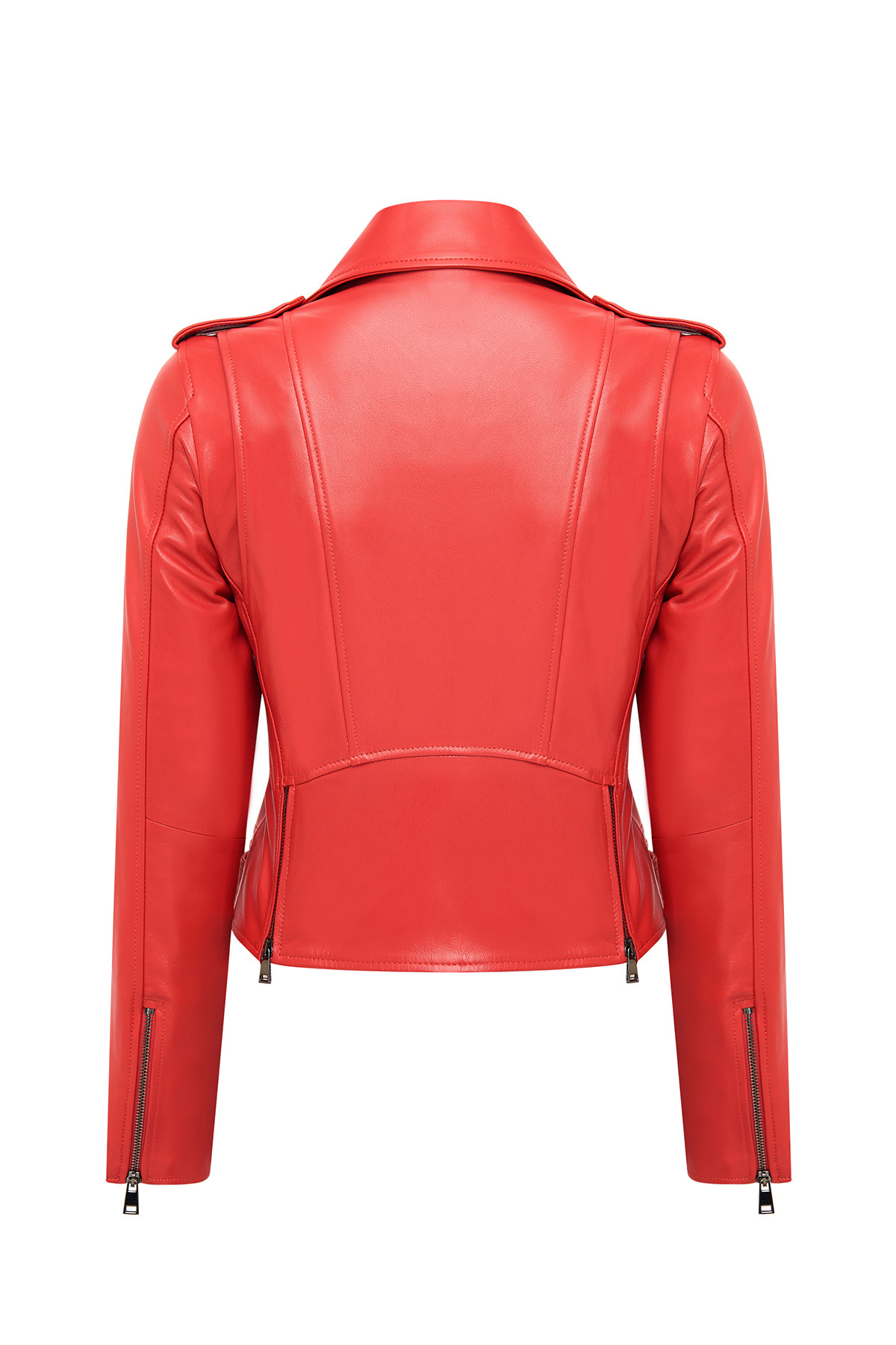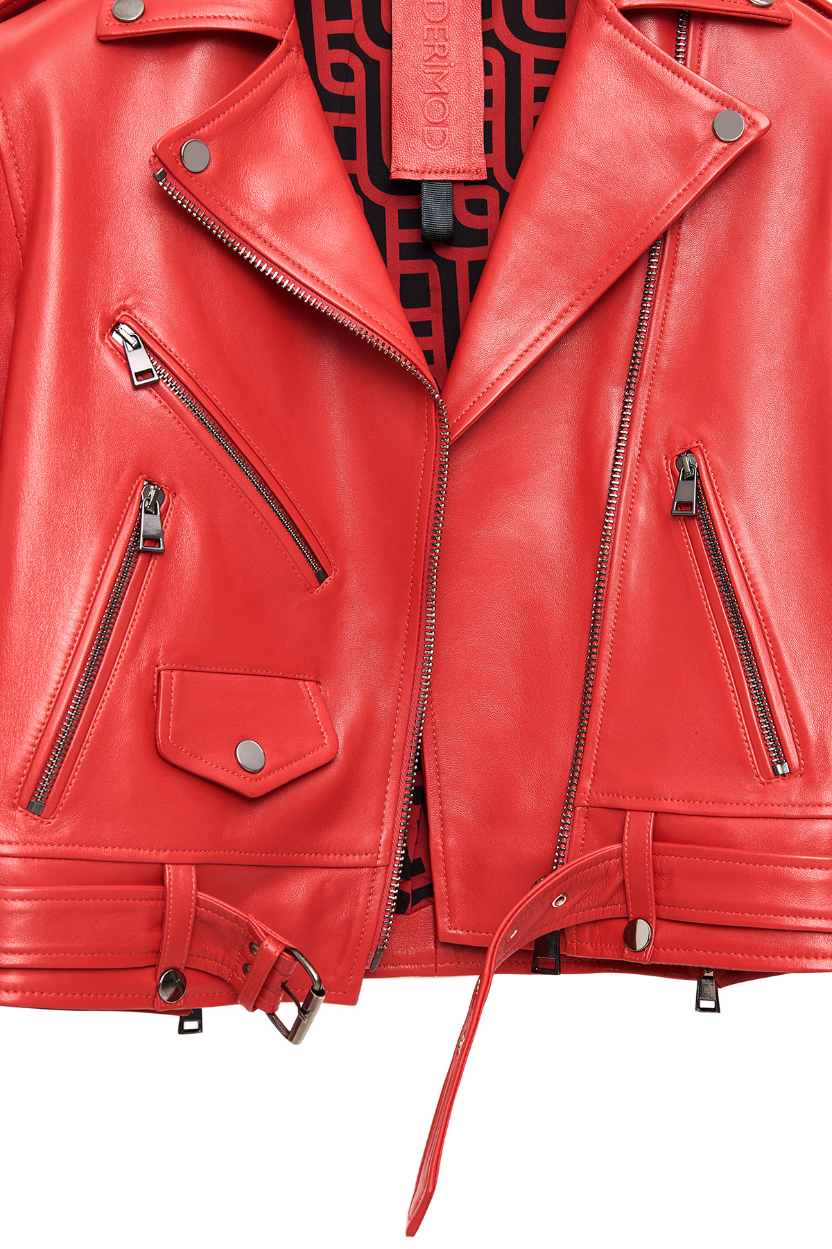 کاپشن چرمی موتورسواری زنانه نیوایج مدل قرمز اسلیم فیت، دارای پوست گوسفند است.