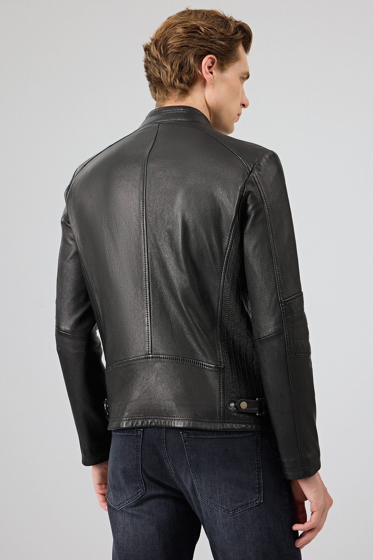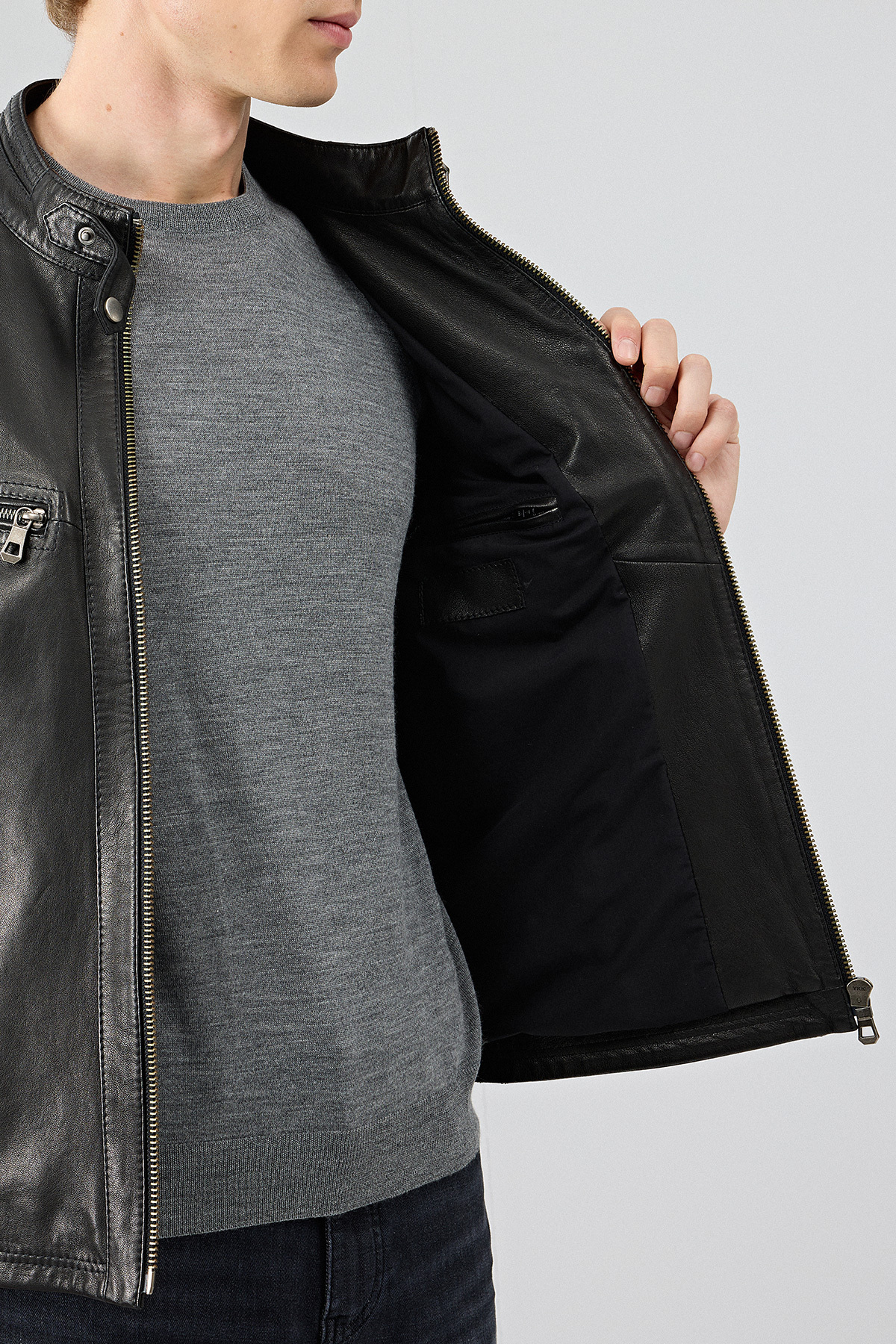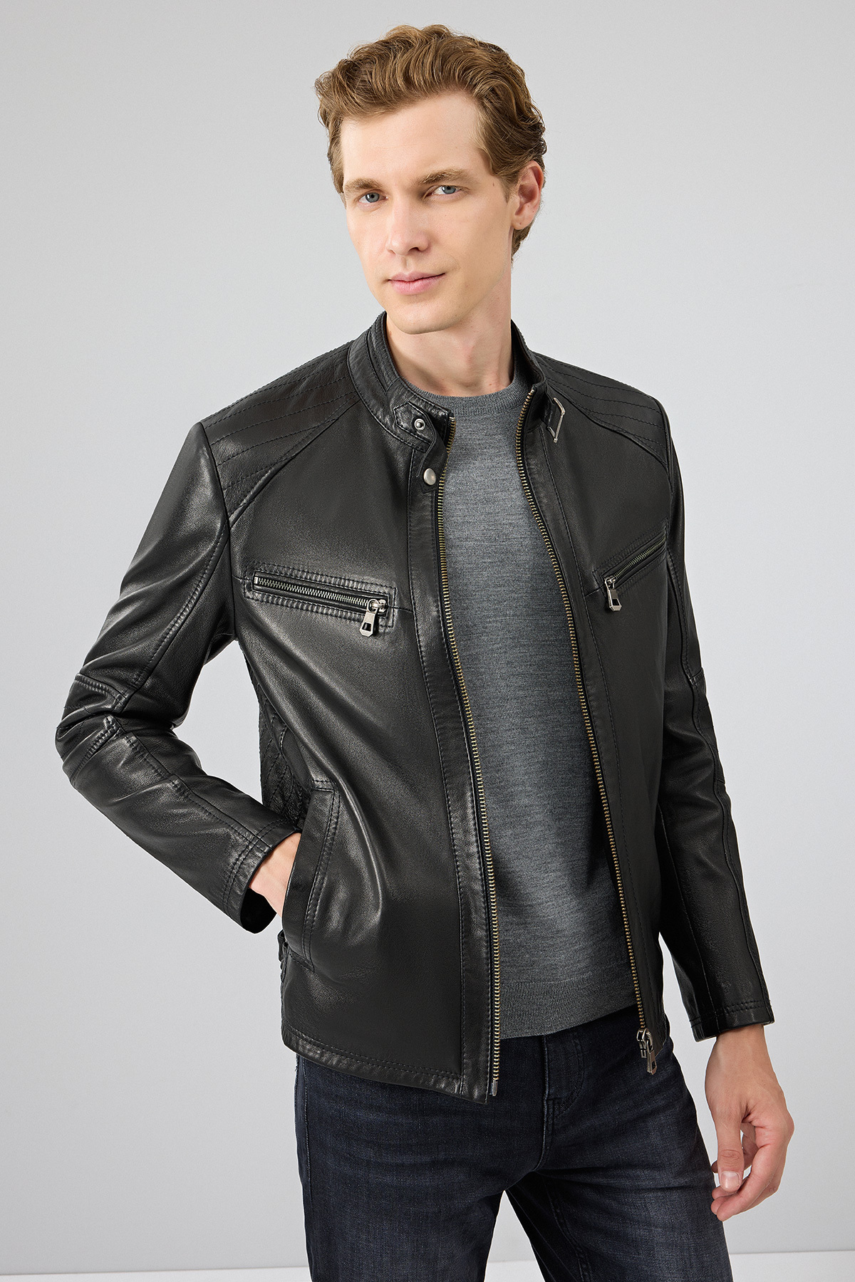 کاپشن چرمی مردانه Jefferson مدل یقه ماندارین مشکی باریک 25WGF6584WF