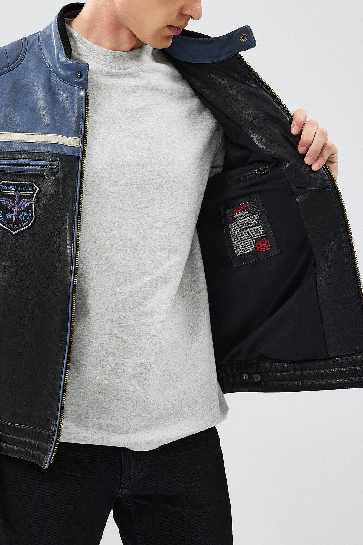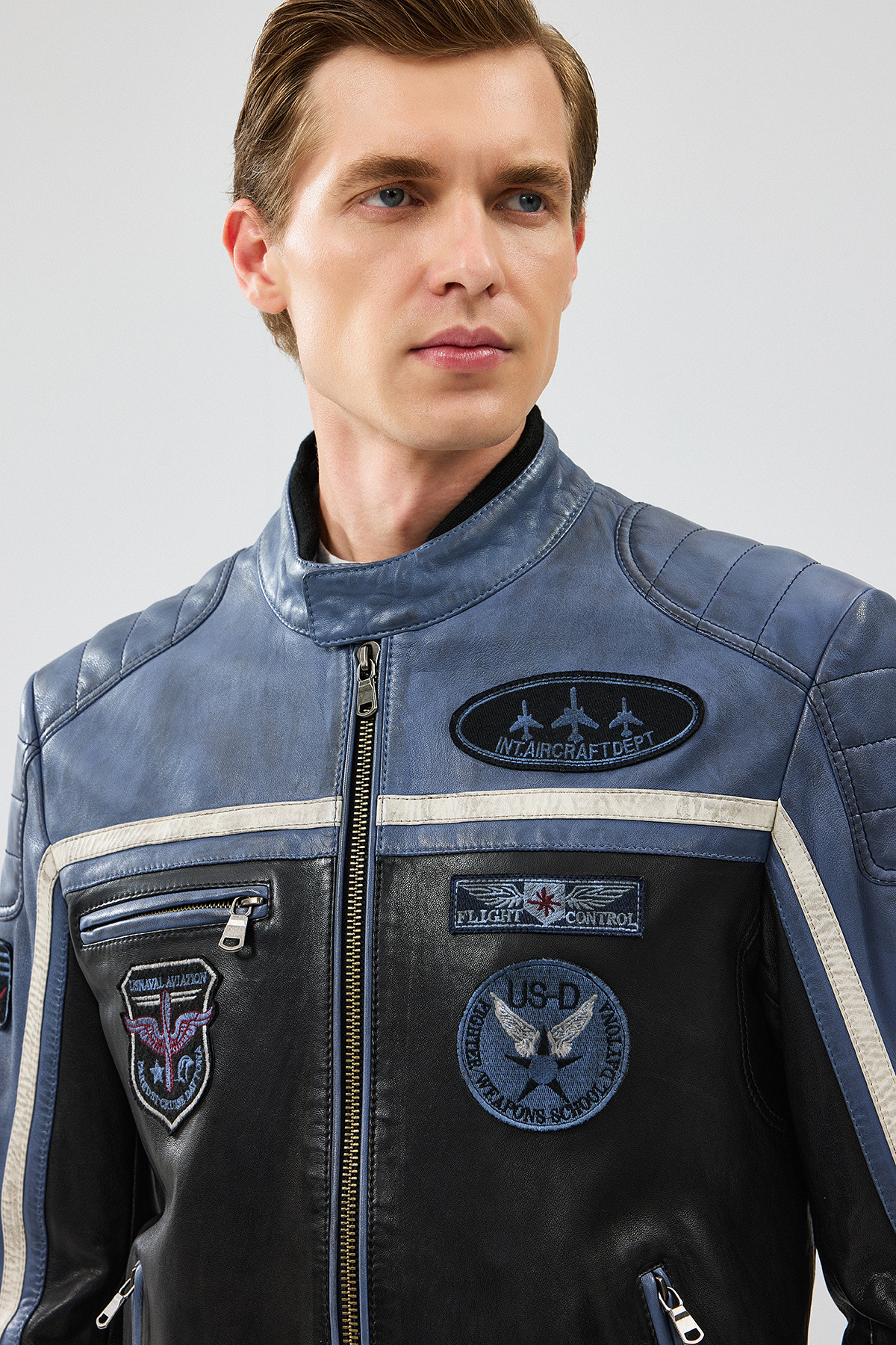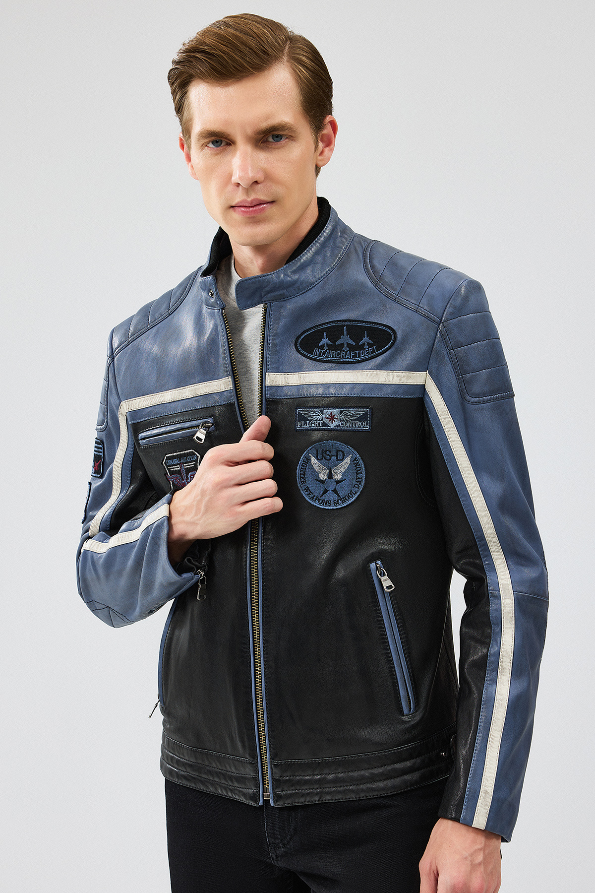 کاپشن چرمی مردانهی آبی رنگ و باریک Takeoff دارای پوست گوسفند است.