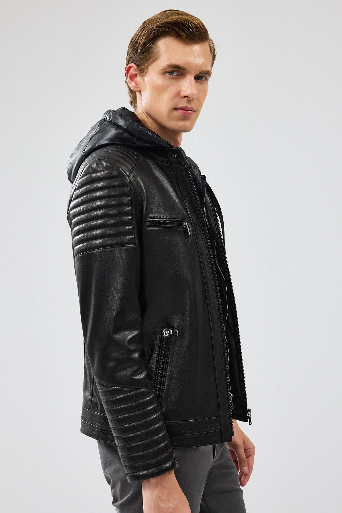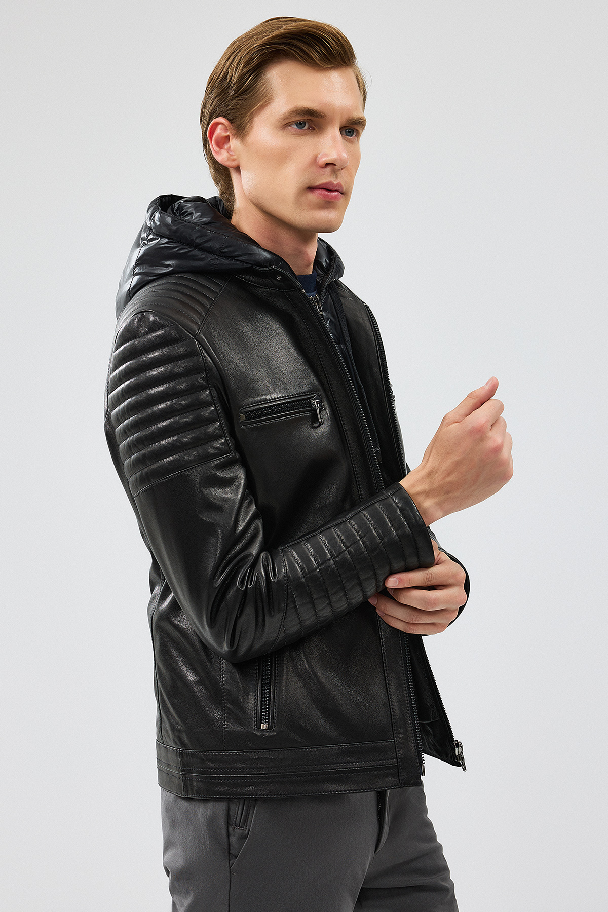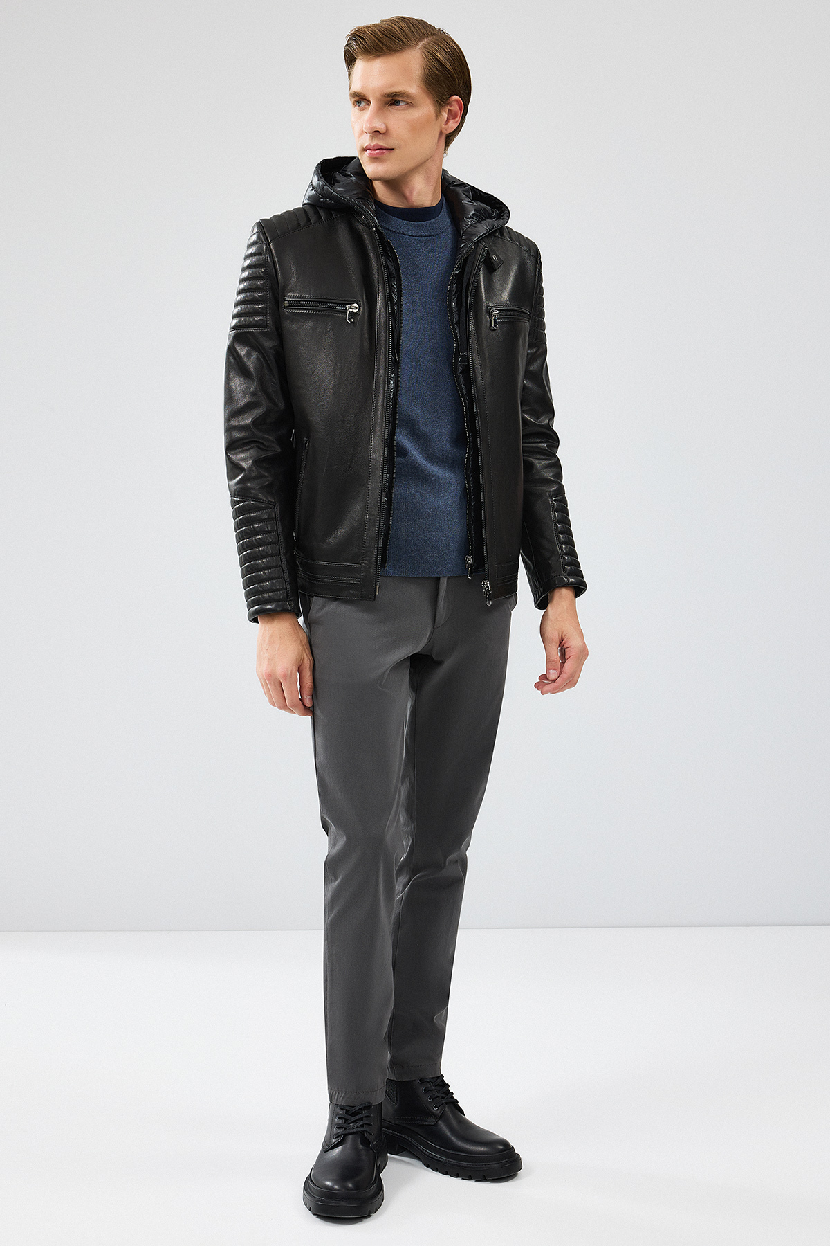 کاپشن چرمی کلاهدار مشکی مردانه لیون مدل ۲۴WGF6530VE