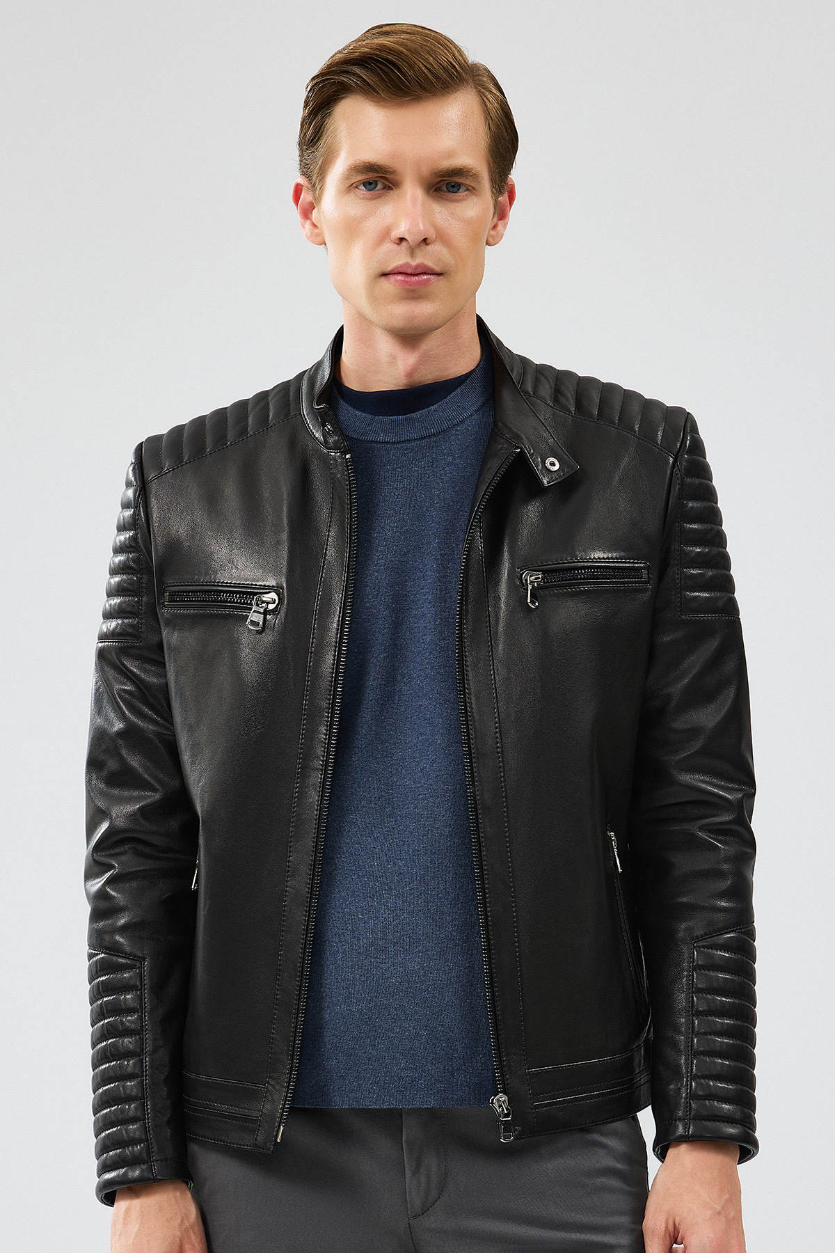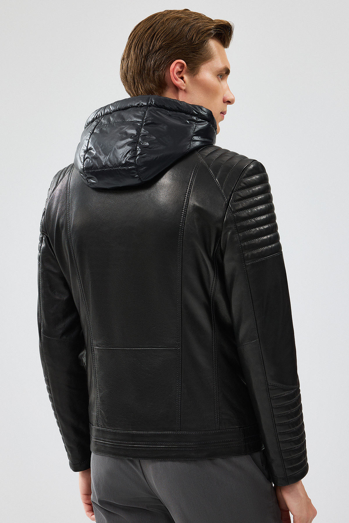 کاپشن چرمی کلاهدار مشکی مردانه لیون، دارای پوست گوسفند است.