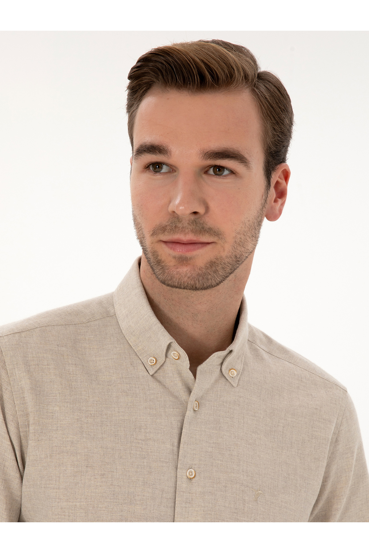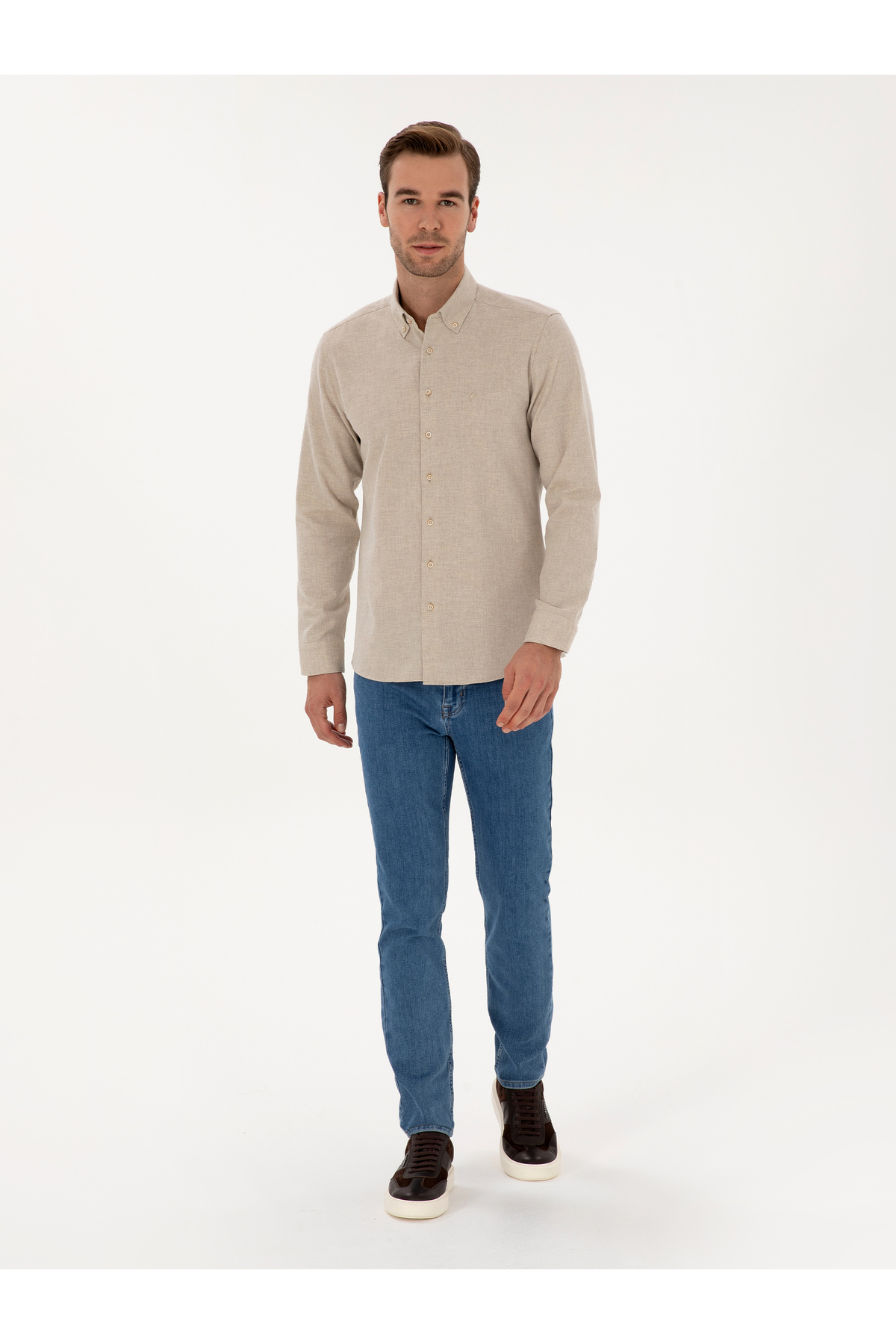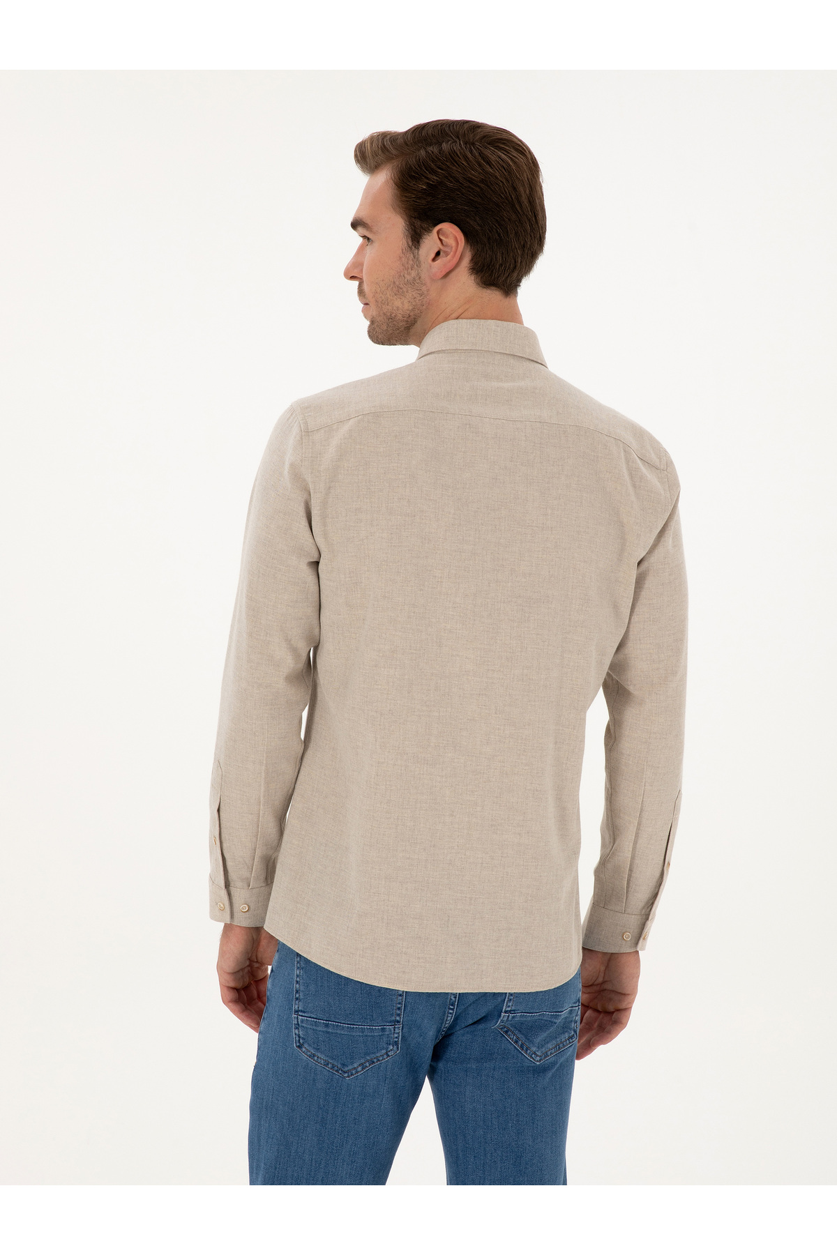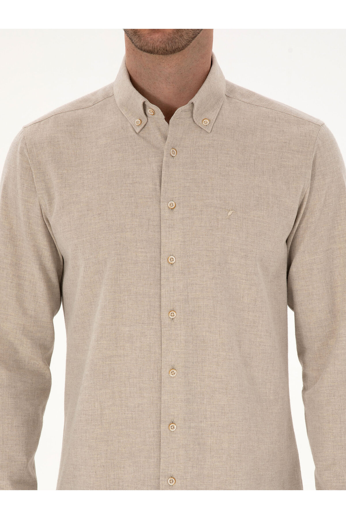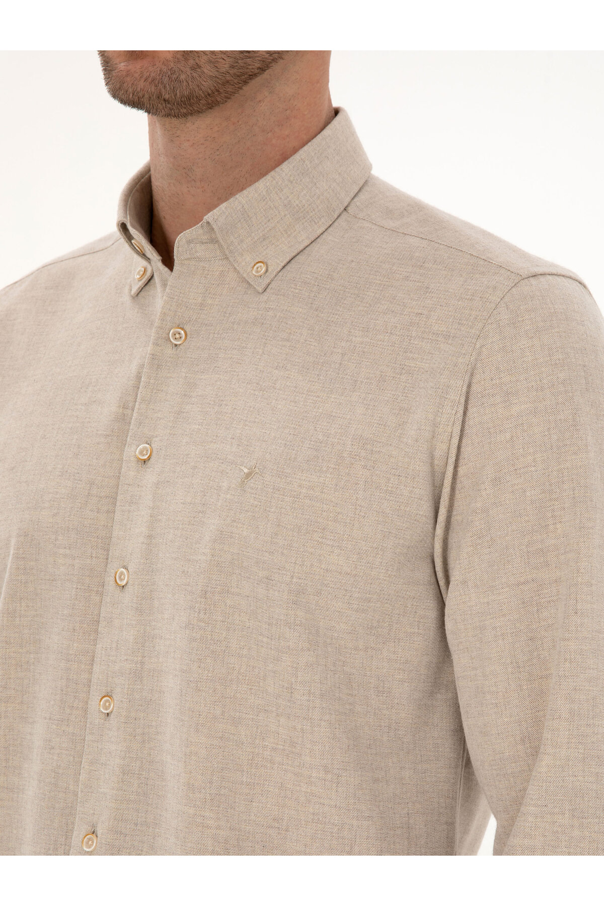 پیراهن فلانل دکمهدار طرح اسلیم فیت بژ نخی ترکیبی برند کاشارل کد:(50318243-VR011)